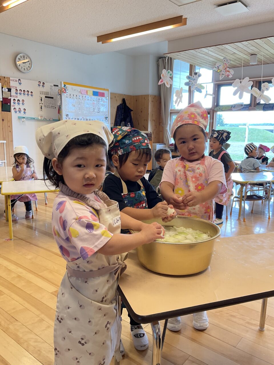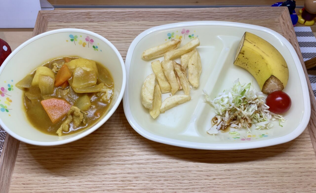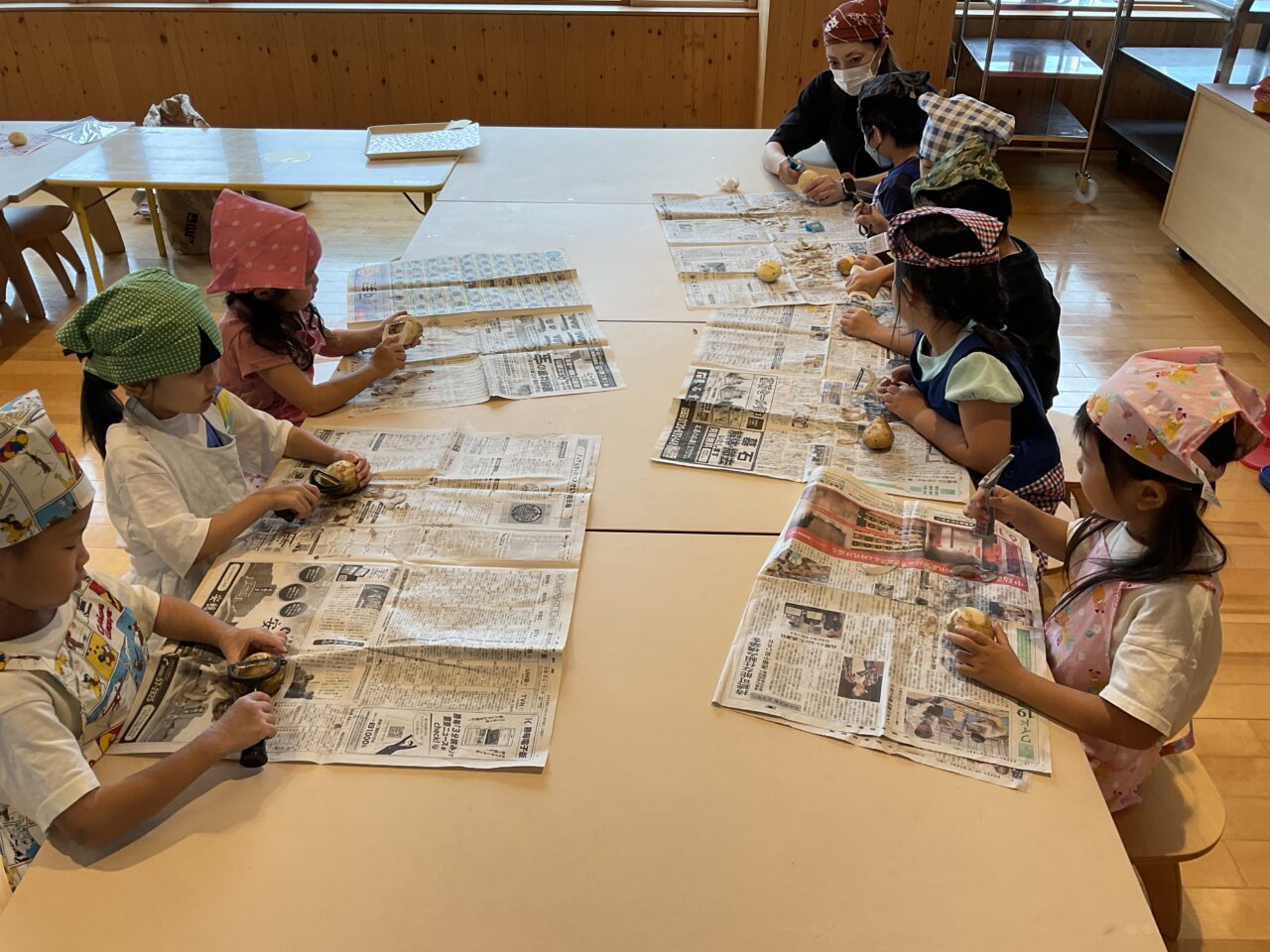 収穫したじゃがいもを給食に 投稿日 2025年9月26日 著者 認定こども園しかおい カテゴリー 認定こども園しかおい 9月26日は収穫祭。こども達が園で育てたじゃがいもを給食のカレーに使いました。5歳児はじゃがいもを、4歳児はにんじんを、3歳児は玉ねぎを担当しました。この日のメニューはカレーライス、ポテトフライ、添え野菜、バナナです。カレーライスとポテトフライに園のじゃがいもを使用しました。