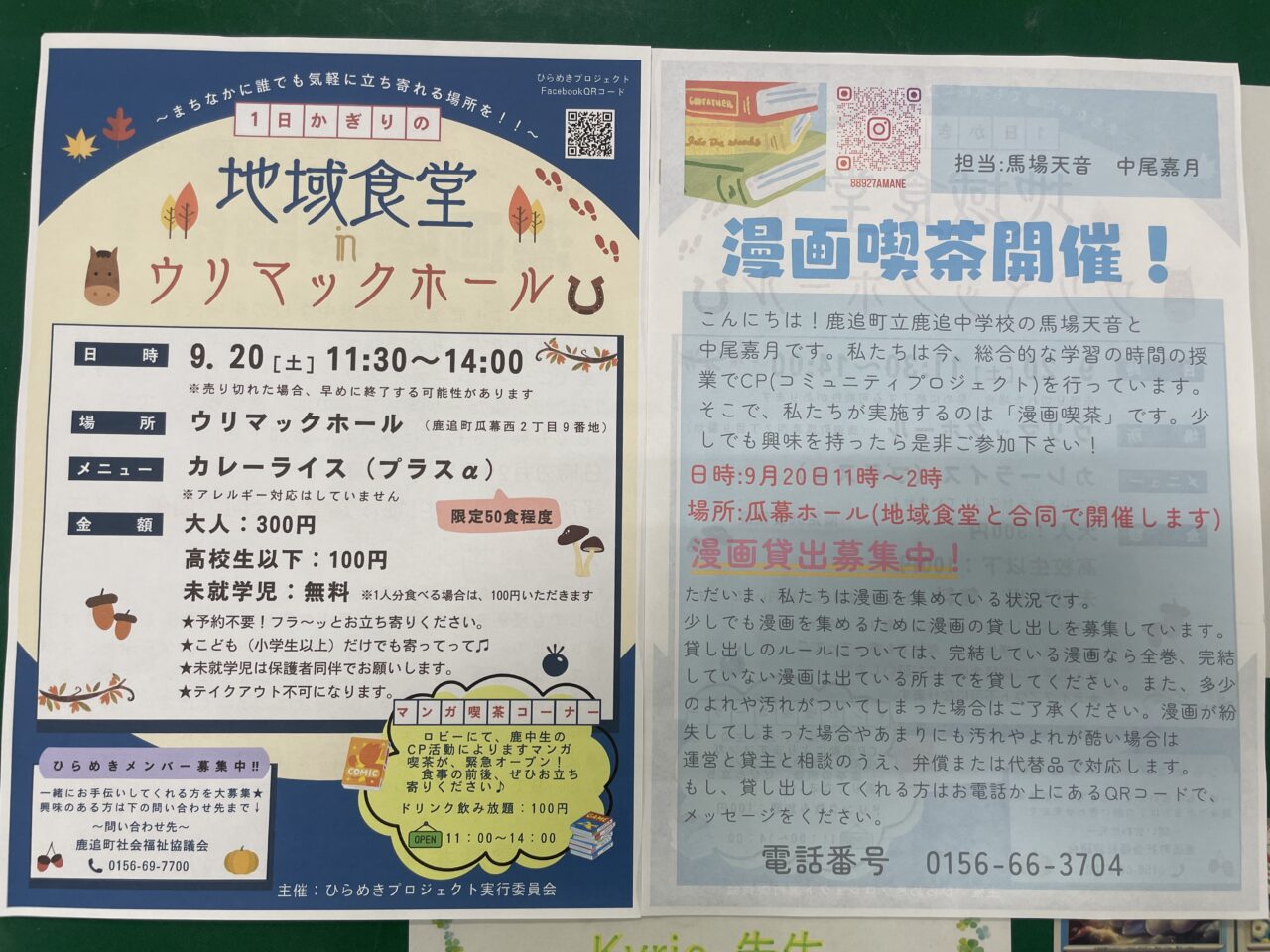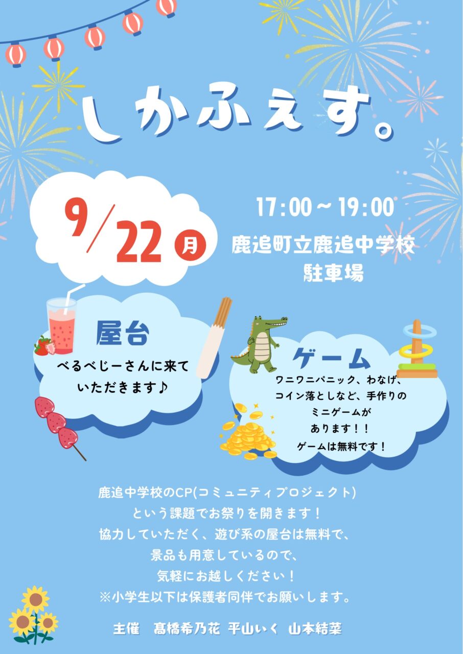 このコミュニティプロジェクトで彼らが立てたプロジェクト数は18個。それらの計画を「実行」に移した生徒も出てきています。先週は、土曜日に地域食堂と連携した「漫画喫茶」の出店や、本校駐車場にて縁日「しかふぇす」が催されどちらも想定を超える盛況さで幕を閉じました。