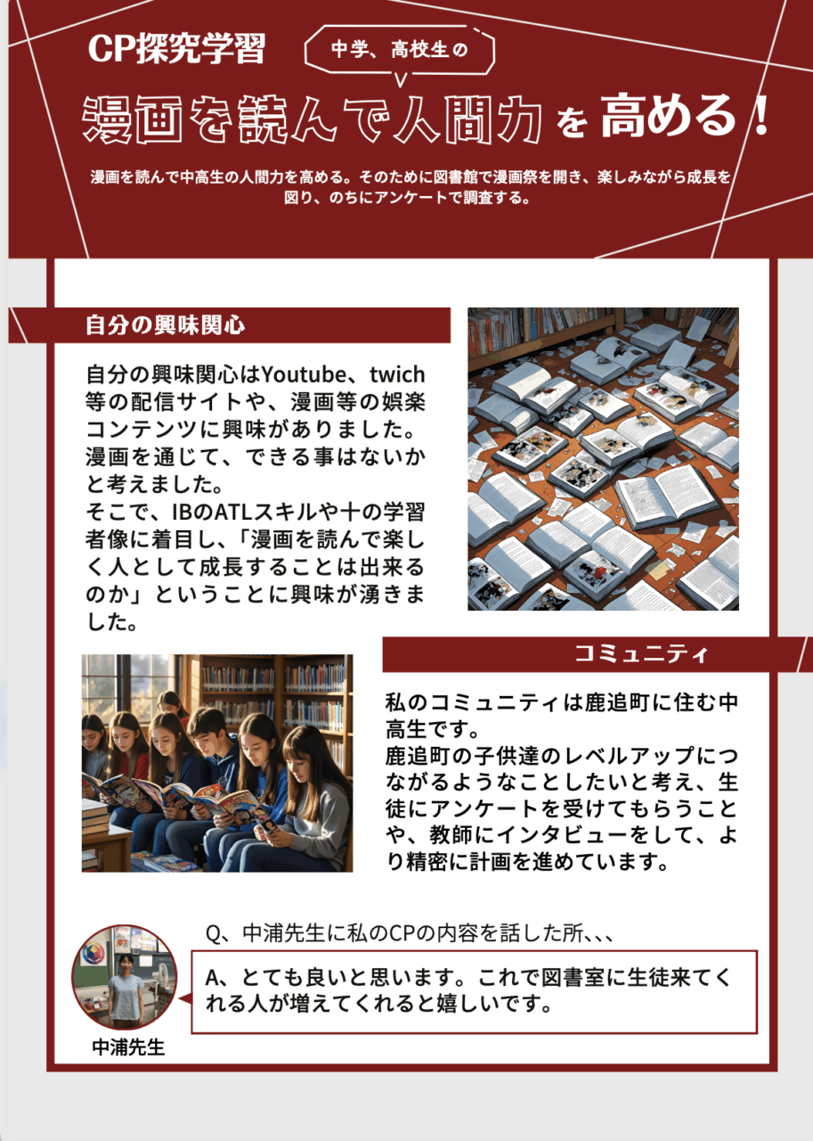 また、今回サブアドバイザーを務めていただいた他学年の先生方にとっても、MYPでの学びの集大成となるこのCPの活動が目指すところや、課題解決の質を高めるために生徒が身につけていくべきスキルを実感するとても良い機会とすることができたと思います。