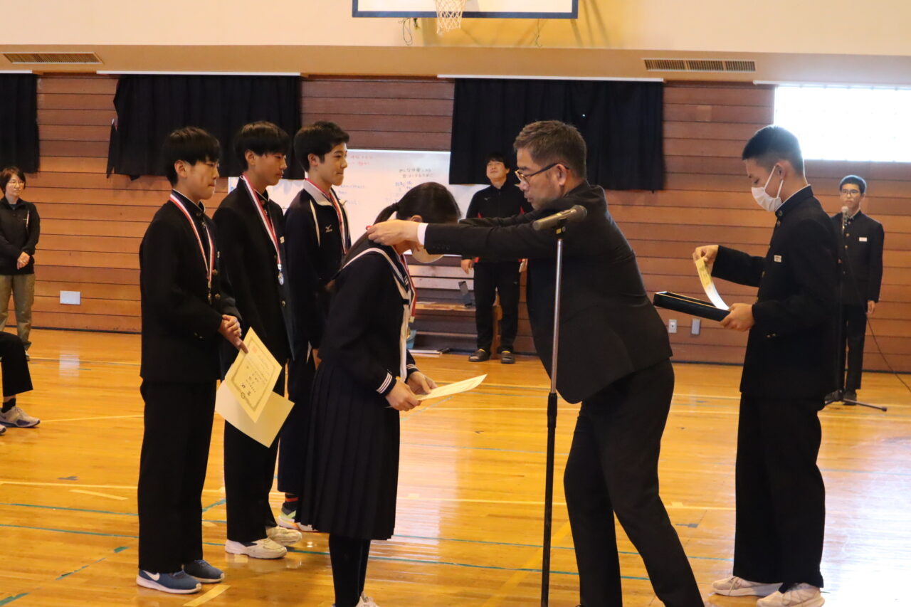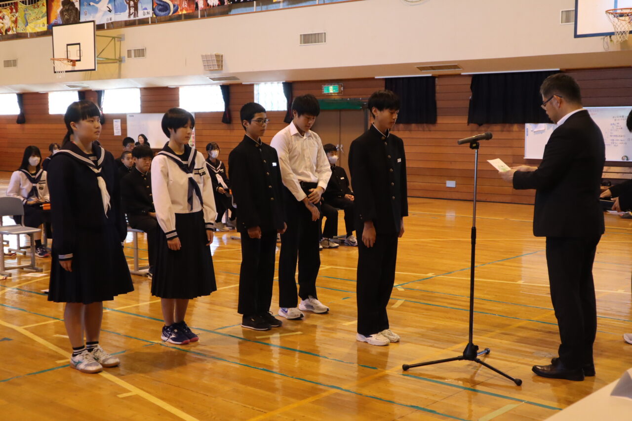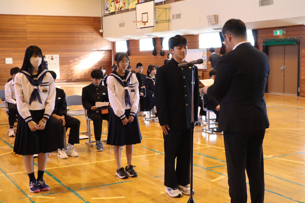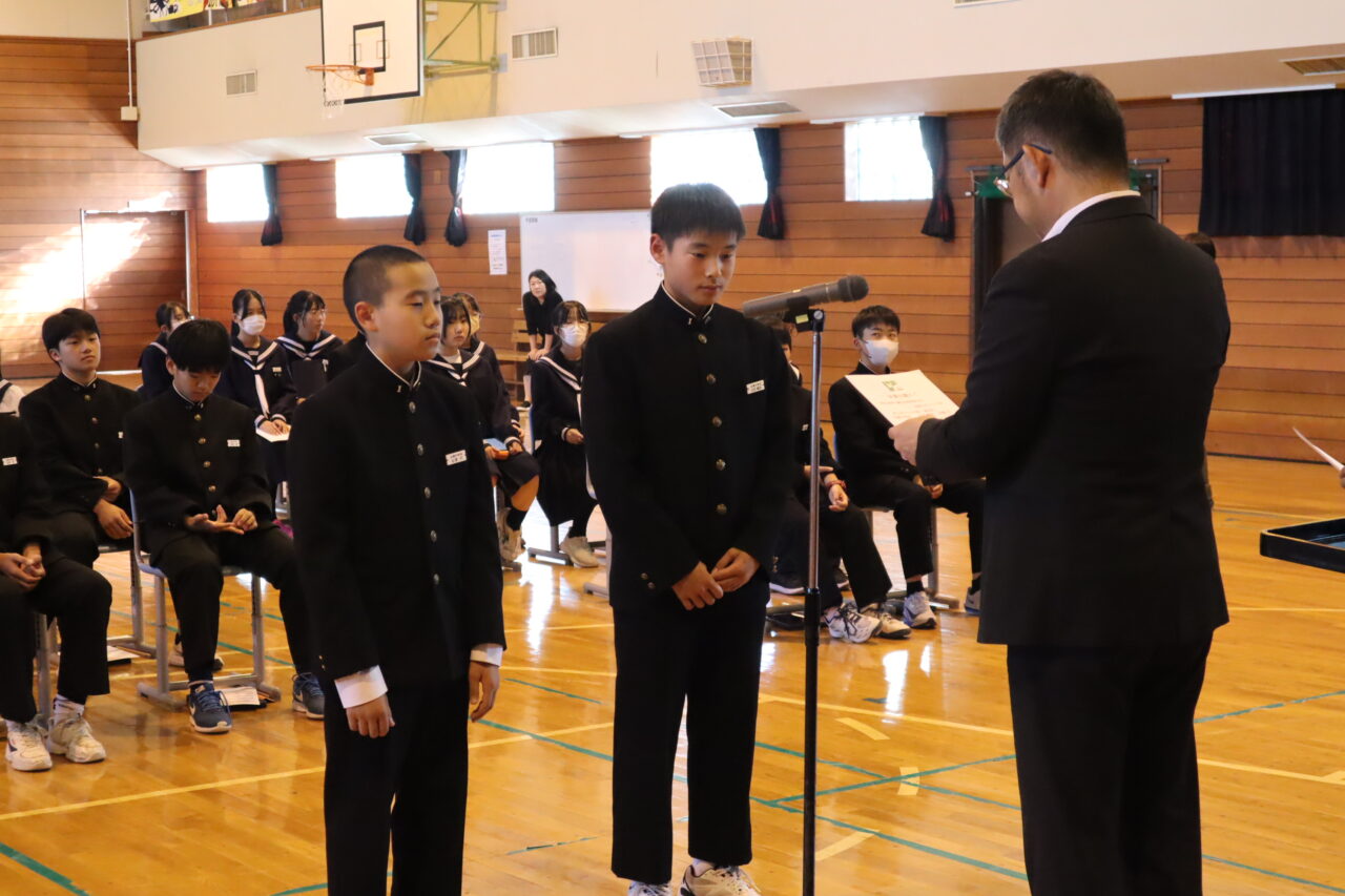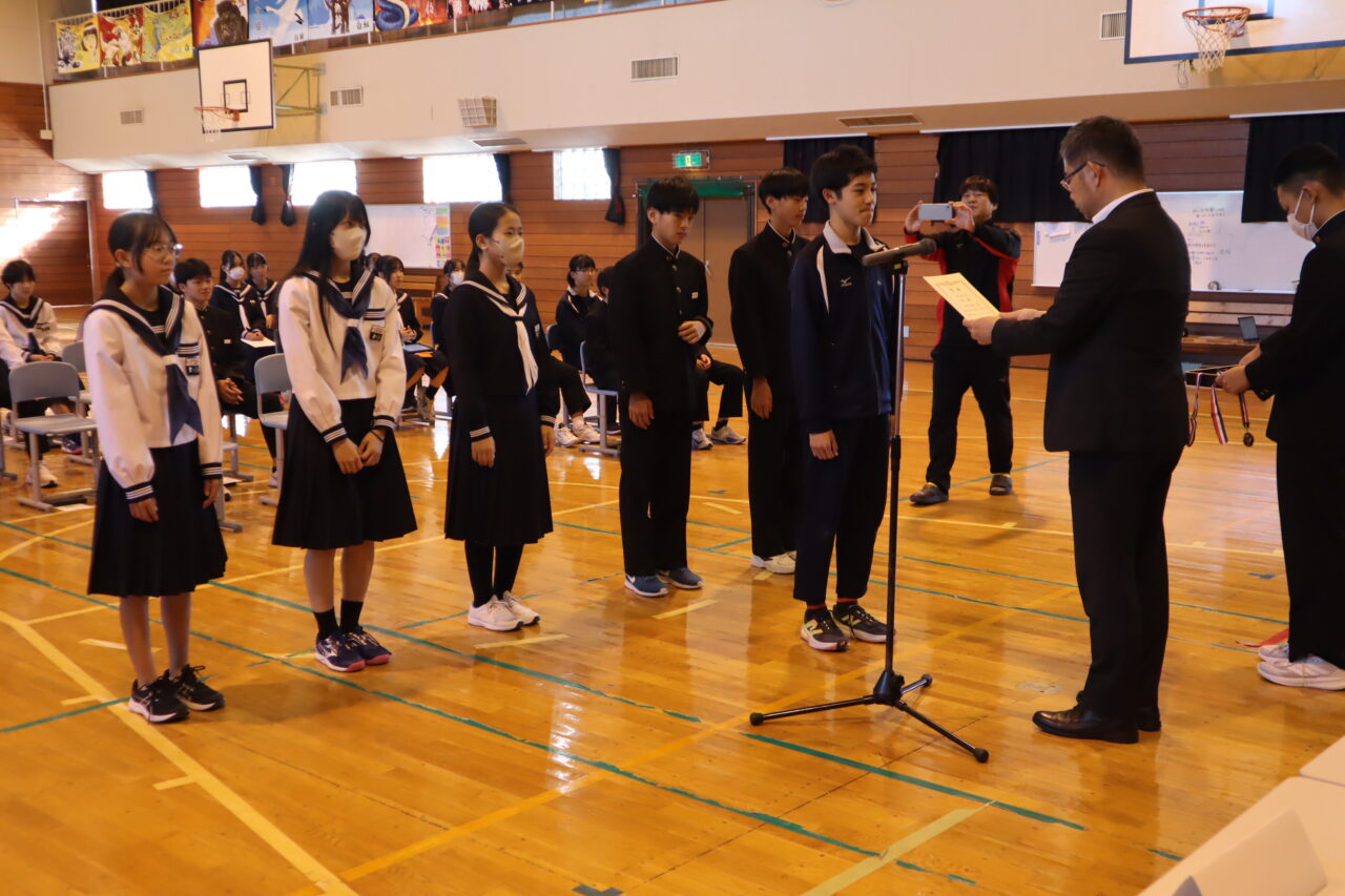 まずはバドミントン部、新人戦での快挙に大拍手!そしてマラソン大会の表彰。その勢いのまま、生徒会認証式へ。校長先生から認証書を受け取る新役員の姿は、まるでスポットライトを浴びるスターのようでした。後期も、羽ばたけ瓜中生!