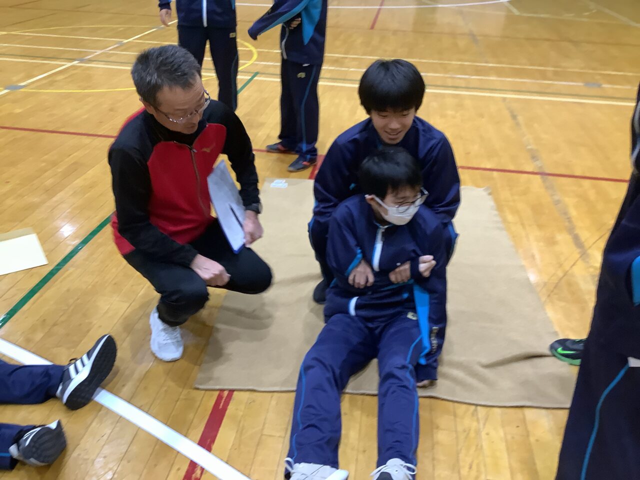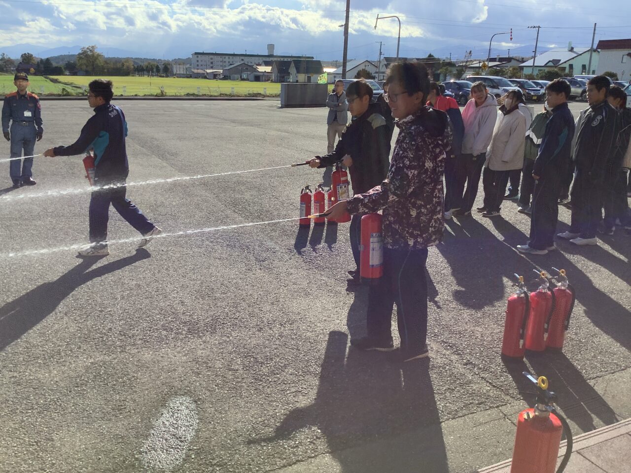 10月20日:鹿追消防署様、東洋通工様のご協力をいただきながら、総合防災訓練を実施しました。昼休みに火災が発生したという想定のもと、避難場所に集合した後にそれぞれの学年で訓練を実施しました。1年生は煙道を通り抜ける訓練、2年生は水消火器を用いた消火訓練、3年生は救助訓練でした。また、教職員も、それぞれの分担に応じて対応を訓練しました。