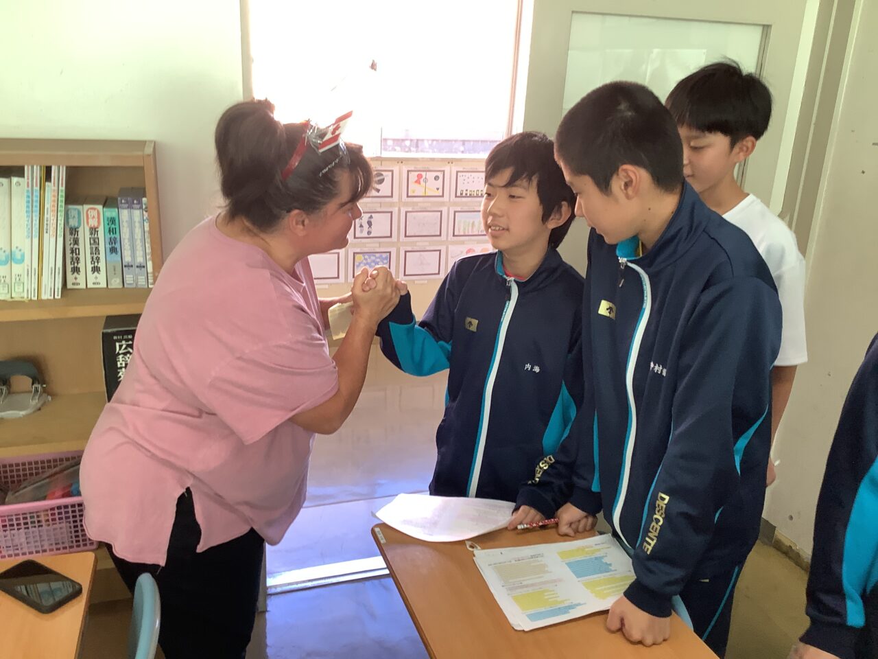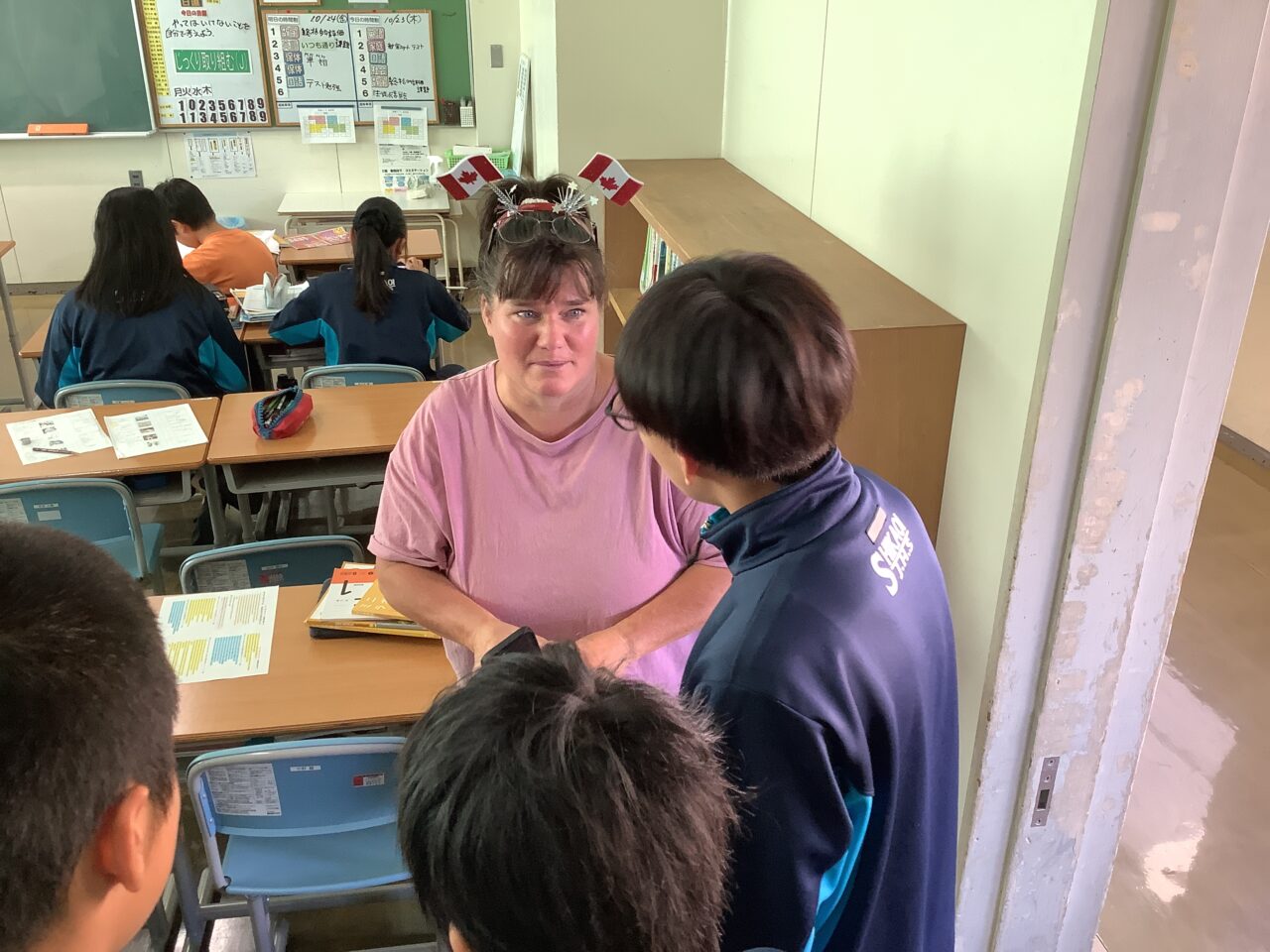 10月24日:町内に滞在中のConnieさんが来校され、1年生の英語の授業に参加しました。教員の経験もある方だそうで、ゆっくりと聞き取りやすいスピードでお話いただきながら、生徒たちとコミュニケーションをとってくださっていました。