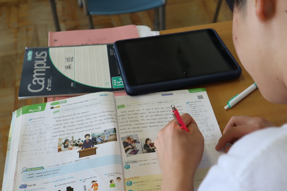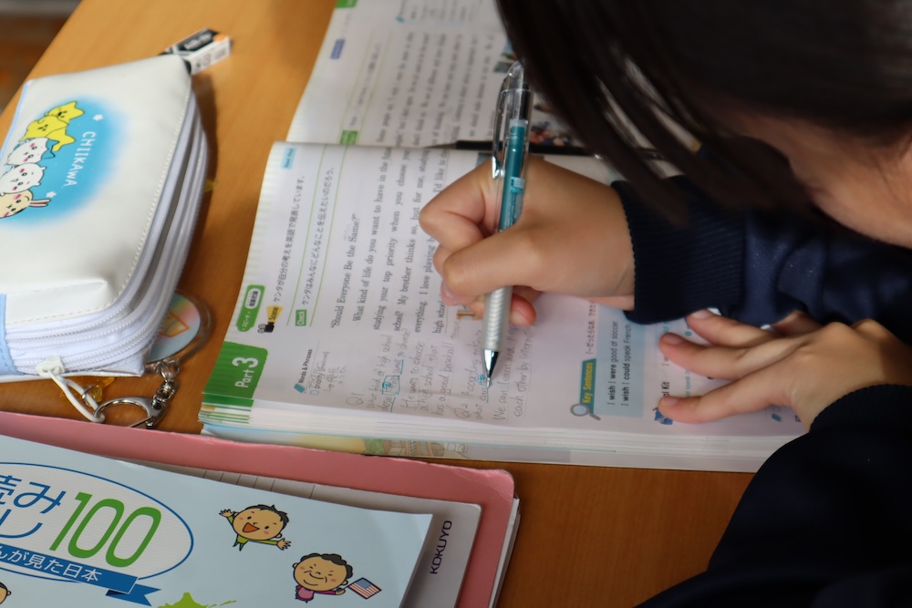 3年生の英語の授業。「先生が言ったことを忘れないようにメモしてます!」とやる気満々。教頭が教室に入ったときはちょうど “inter” の意味を考えていました。「インターネットの“インター”?」「インタビューの“インター”?」「インターナショナル“インター”?」「インターチェンジの“インター”?」と、今ある知識をつなげながら意味を探る子どもたち。英語って、調べるほどおもしろーい!