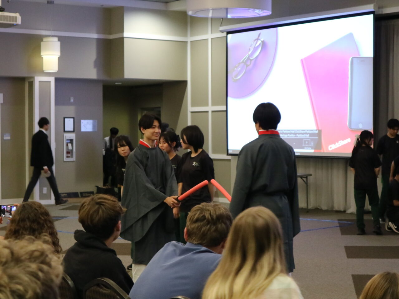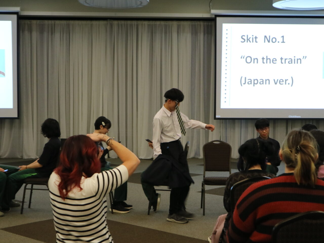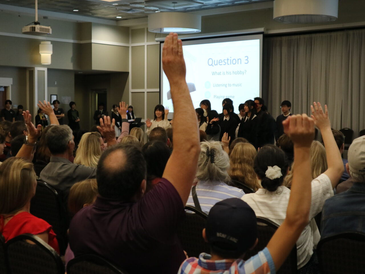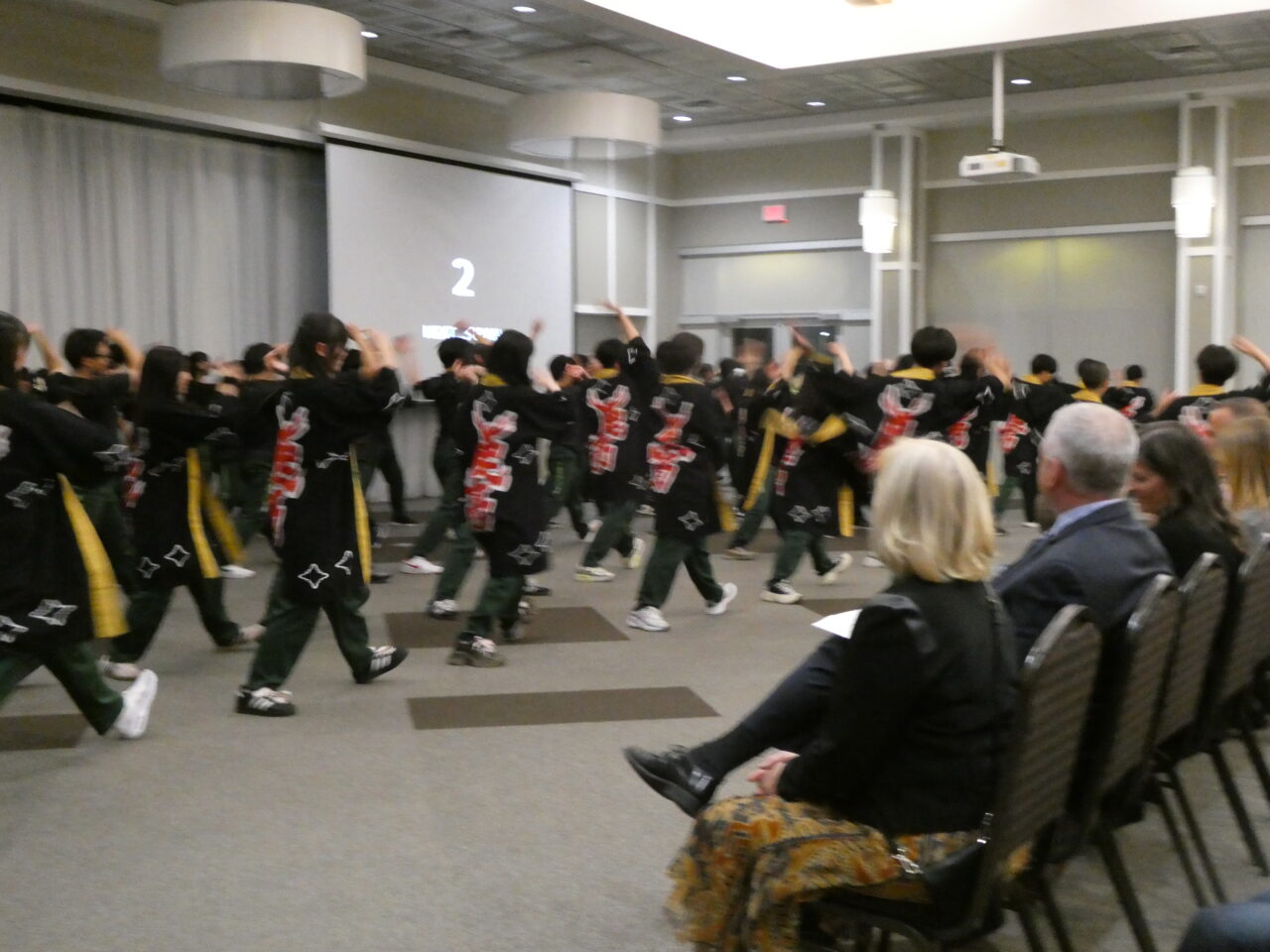 また文化紹介ではカナダと日本の電車での過ごし方の違いを紹介した際に、会場が笑い声に包まれました。「よさこい」では、ホストファミリーの方々に「どっこーしょ」や「ソーラン」など掛け声に参加していただき、披露終了後は大歓声に包まれました。