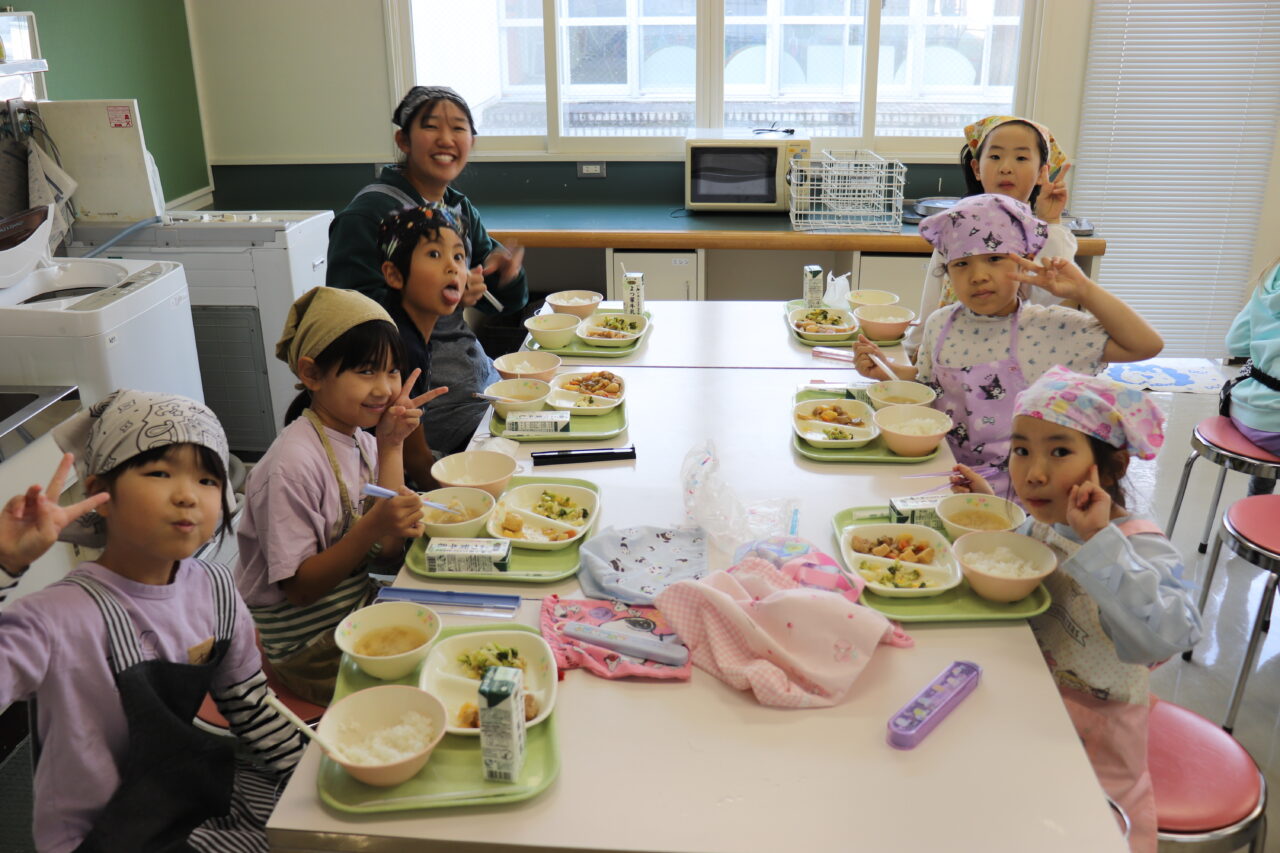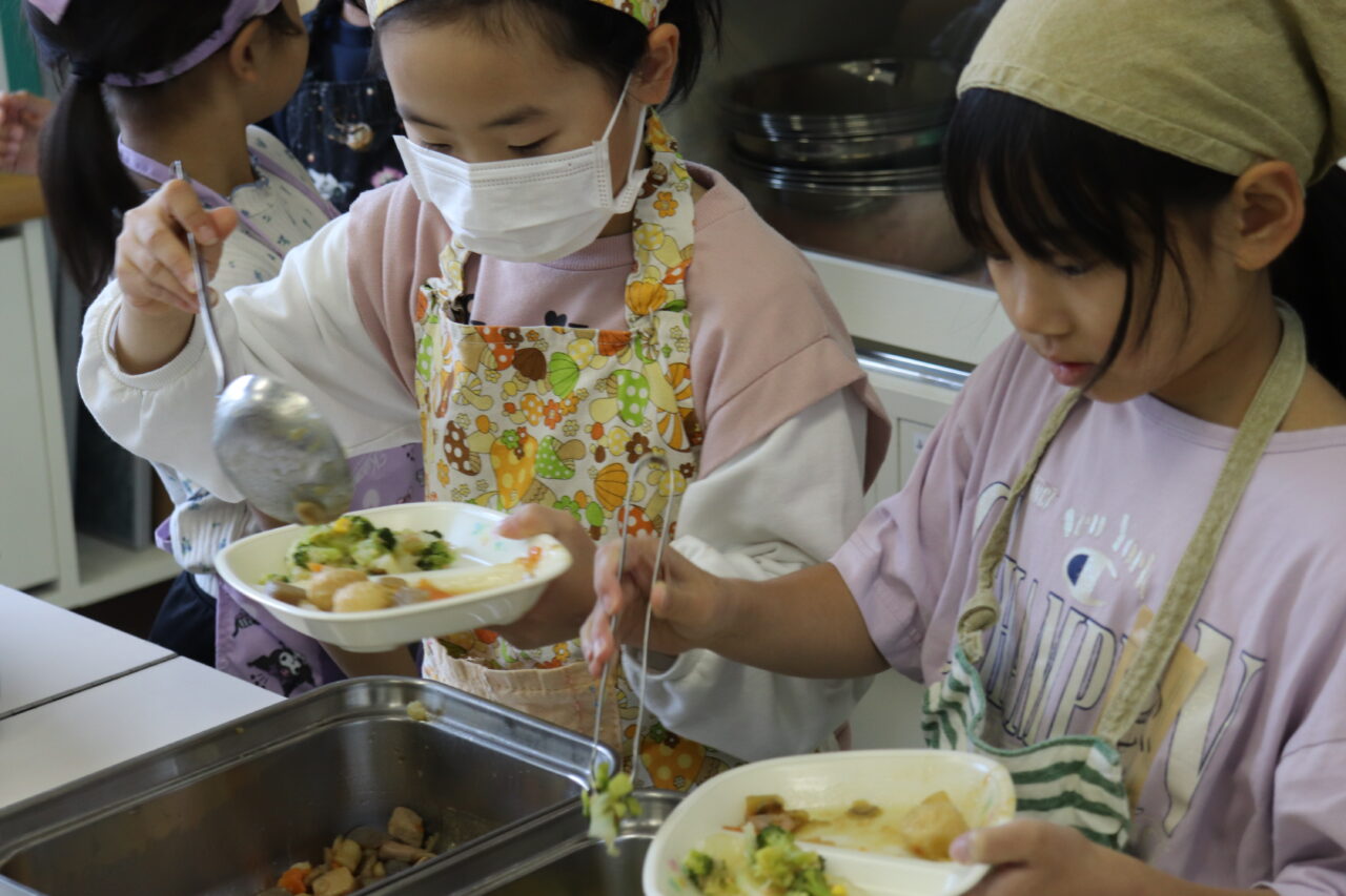 勉強を頑張ったあとは家庭科室でみんなで楽しい給食タイム🎵 盛り付けも協力して上手にできていました(*´∇`*)