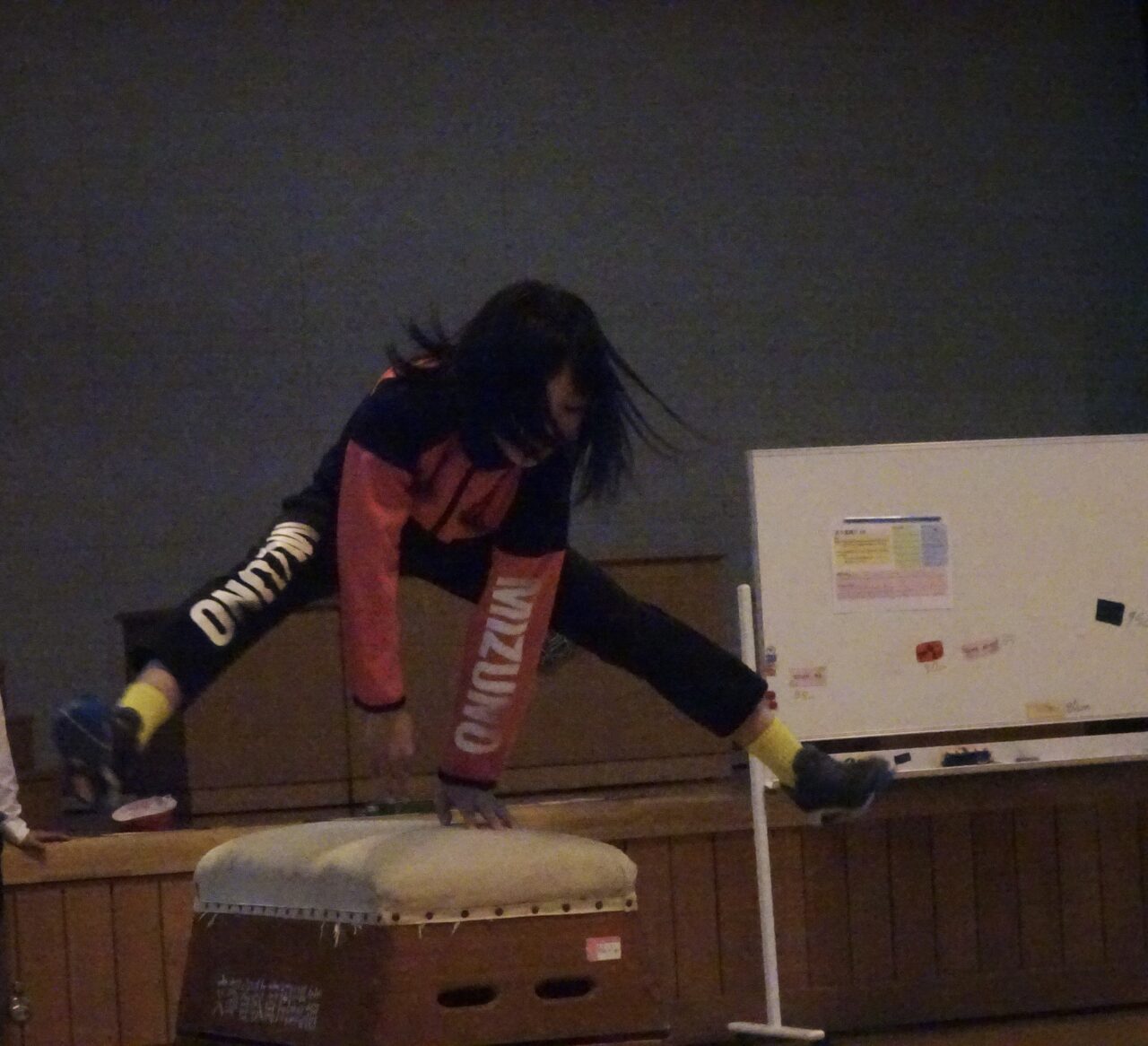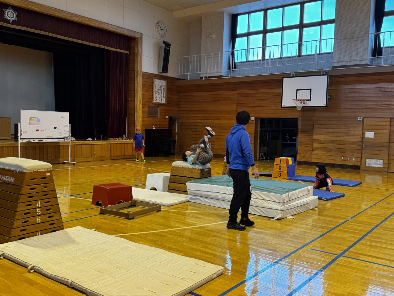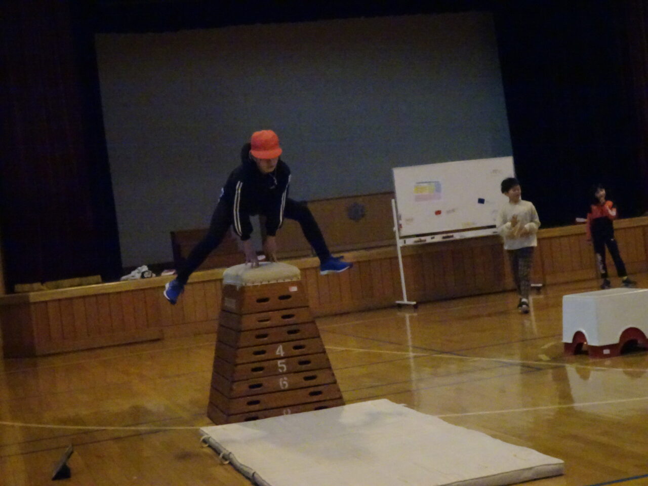 高学年の体育の跳び箱は、開脚跳びから閉脚跳び、台上前転へとレベルアップしていきます。開脚跳びでは高い段を跳べても、閉脚跳びや台上前転は違うタイミングであったりするため、子どもたちは苦労していました。コツを掴めるまでもう一踏ん張りです。