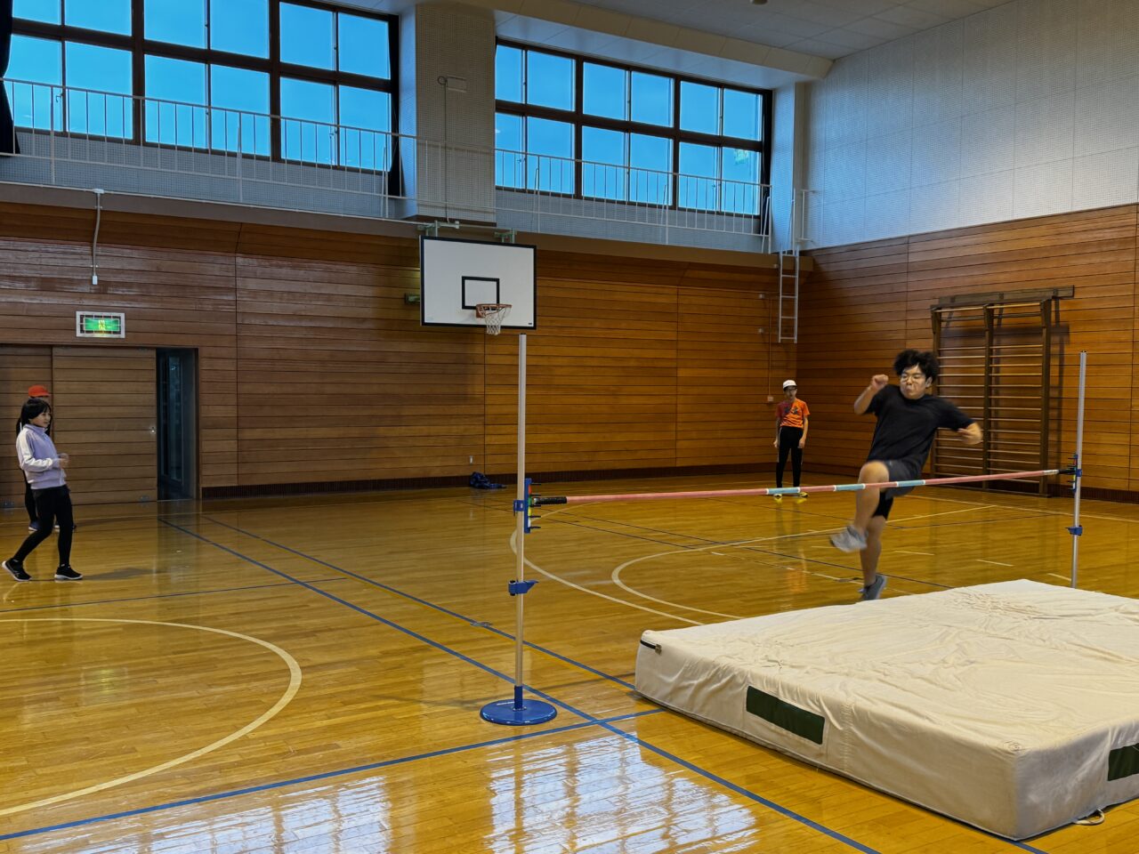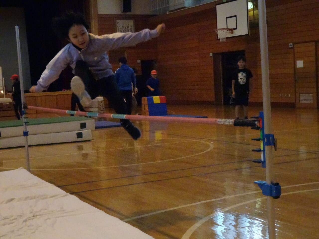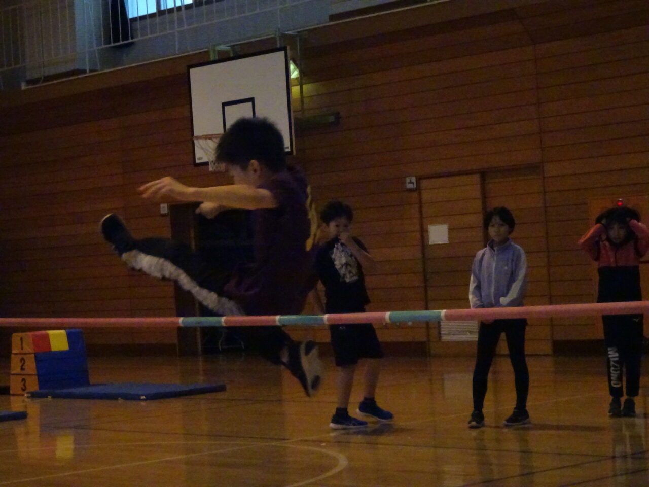 走り高跳びは、足を高く上げられる方がどちらの足なのかを探るところから始まりました。また跳びやすいタイムングを掴むために、助走の距離や入る角度を確認しながら取り組んでいました。そして、前回95cm跳べた子が1mや1m5cm跳べた子もいました。次回からも自分の記録にチャレンジしてほしいと思います。