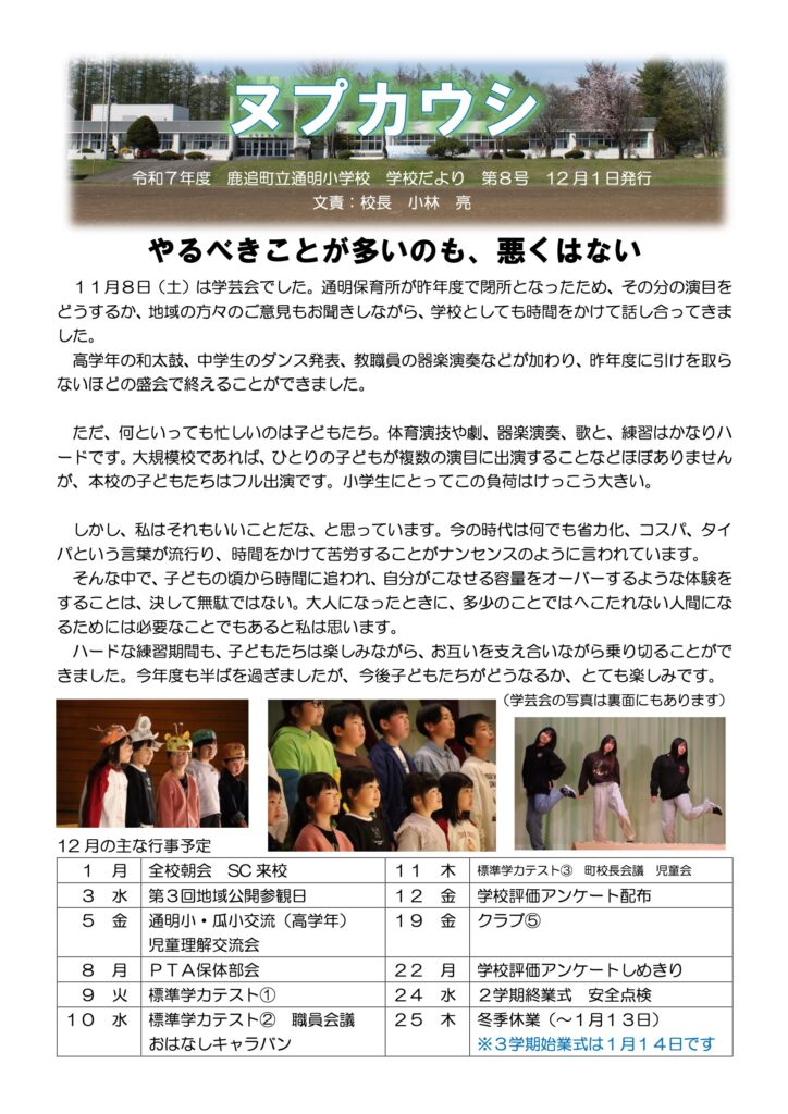 いよいよ師走の12月が始まりました。近隣の学校から学級・学校閉鎖の知らせが届くほど、インフルエンザウイルスが猛威を振るっております。全校朝会では校長先生からインフルエンザウイルスの予防について、しっかり朝ごはんを食べること、十分な睡眠をとることのお話がありました。文部科学省も「子どもたちの健やかな成長のためには適切な運動、調和のとれた食事、十分な休養・睡眠など基本的な生活習慣が大切である」としています。長かった2学期もあと1ヶ月。学校では学期末でやらなければいけないこともあり、慌ただしい毎日が続きます。体調管理には十分お気をつけください。