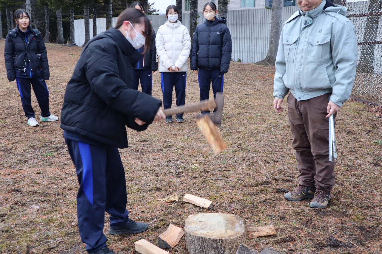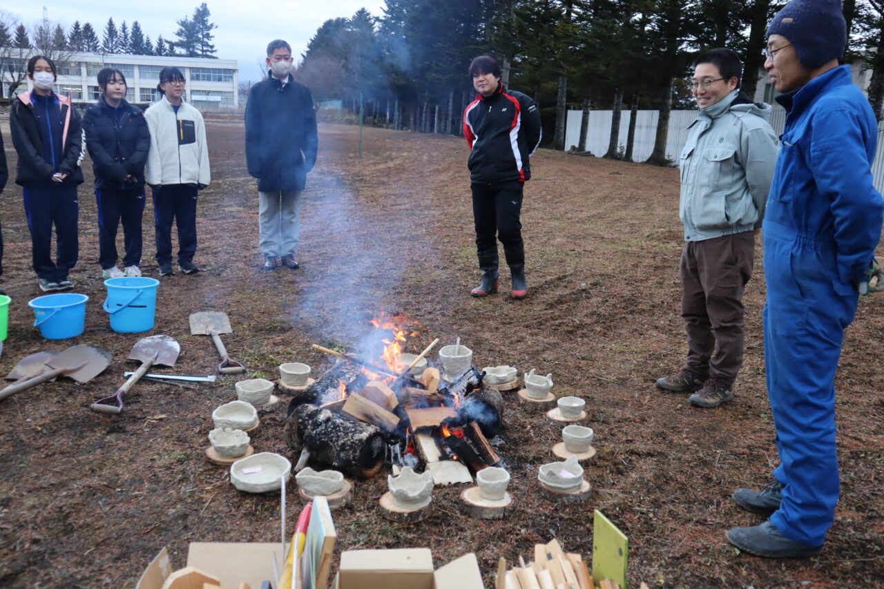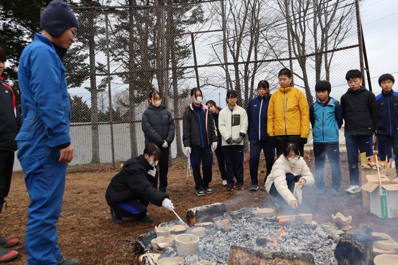 縄文に タイムスリップ 1年生 投稿日 2025年12月2日 著者 瓜幕中学校 カテゴリー ニュース カテゴリー 瓜幕中学校 「腰が入ってない!」と檄が飛ぶ中、薪を割り、焚き火…じゃなく縄文土器焼きに挑む1年生!鹿追の粘土で自作した土器で料理まで!作った料理は給食と一緒にいただきました。今回の学びでご協力いただいた鹿追ジオパークセンターの皆様、ありがとうございました!令和の縄文人、かっこよかったよ! 「 火を囲み 昭和の焼き芋 思い出す 」by教頭 生徒がつくった縄文土器を火の回りに置いて… 焼く 作った土器で調理 本日の給食のおかずが三品増えました