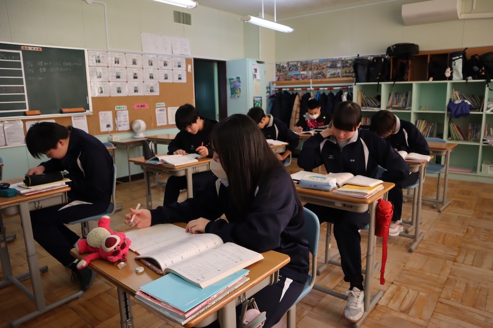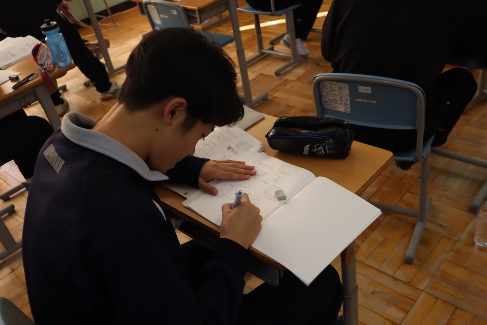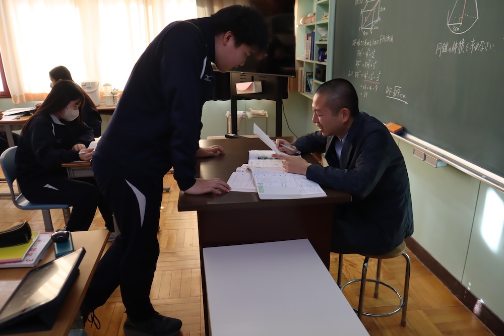 3年生の数学・図形の授業。教頭が「できた?」と聞くと、「できました!」と誇らしげな声。天才。さらに、できた生徒が友達へヒントを伝える姿も。教室に優しい風が流れ、最後は全員が正解に到達。みんな天才でした。