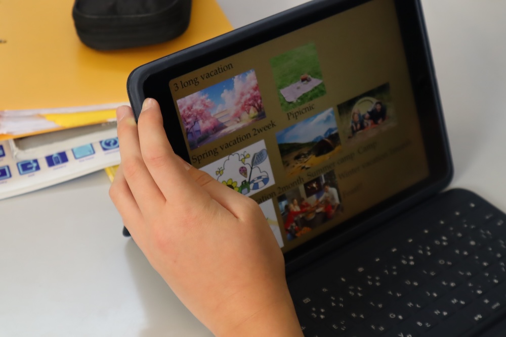 図書室に豪華な椅子があります。思わず「よっ、社長!」と言ってしまいましたが、座っているのは英語の発表資料を作っていた1年生の生徒でした。iPadを駆使した学びの成果を見せてもらい、他の生徒も集まってくる様子は、まさに高め合う学びの姿。今年度中のIB認定に向けて、瓜中生の学びは熱いです。