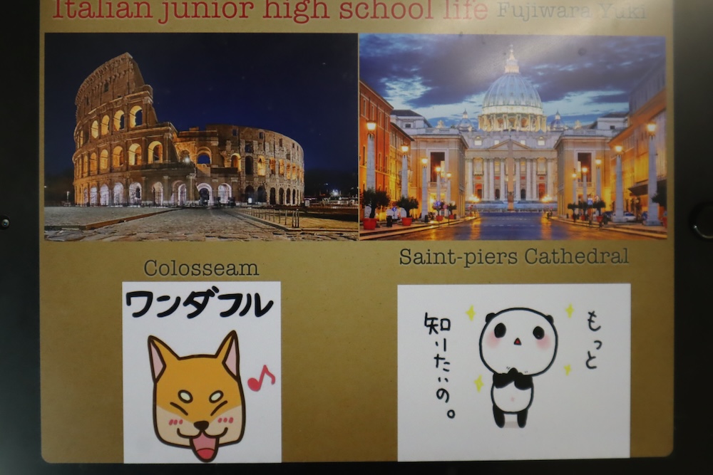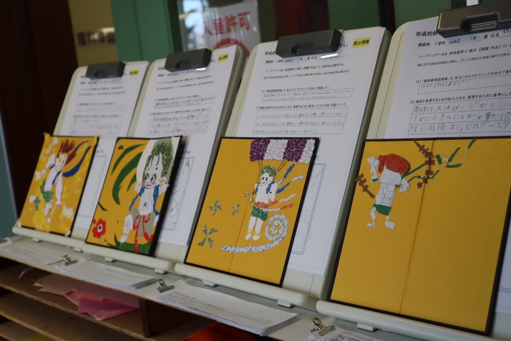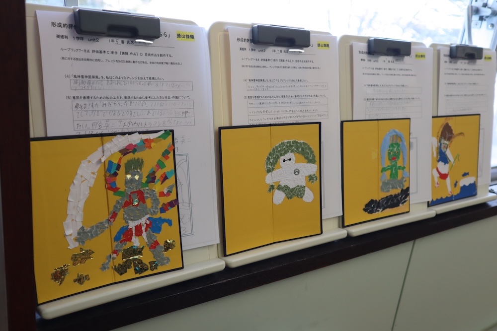 廊下には1年生の美術の作品が展示されています。レポートと一緒に展示された作品を眺めると、学びの過程が充実していることがわかります。