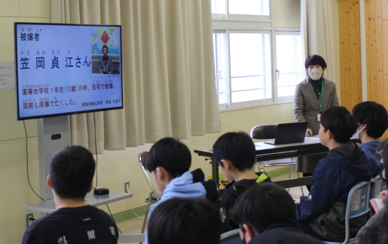 広島平和文化センターの被爆体験伝承者である岡田令恵子さんを講師に迎え、原爆被爆伝承者講演が行われました。講演では、実際に被爆された笠岡さんの体験を、子どもたちにもわかりやすくお話しいただきました。