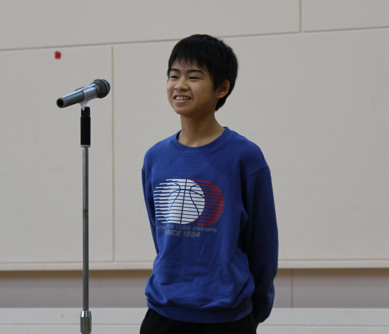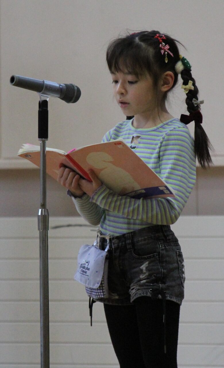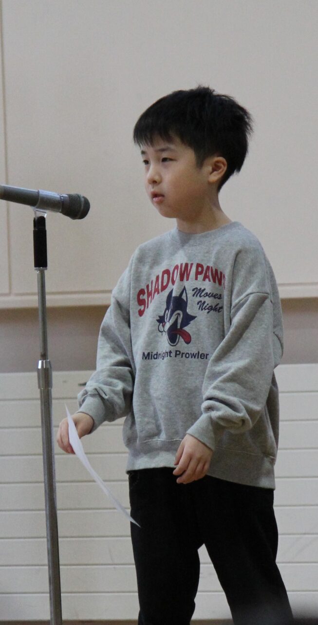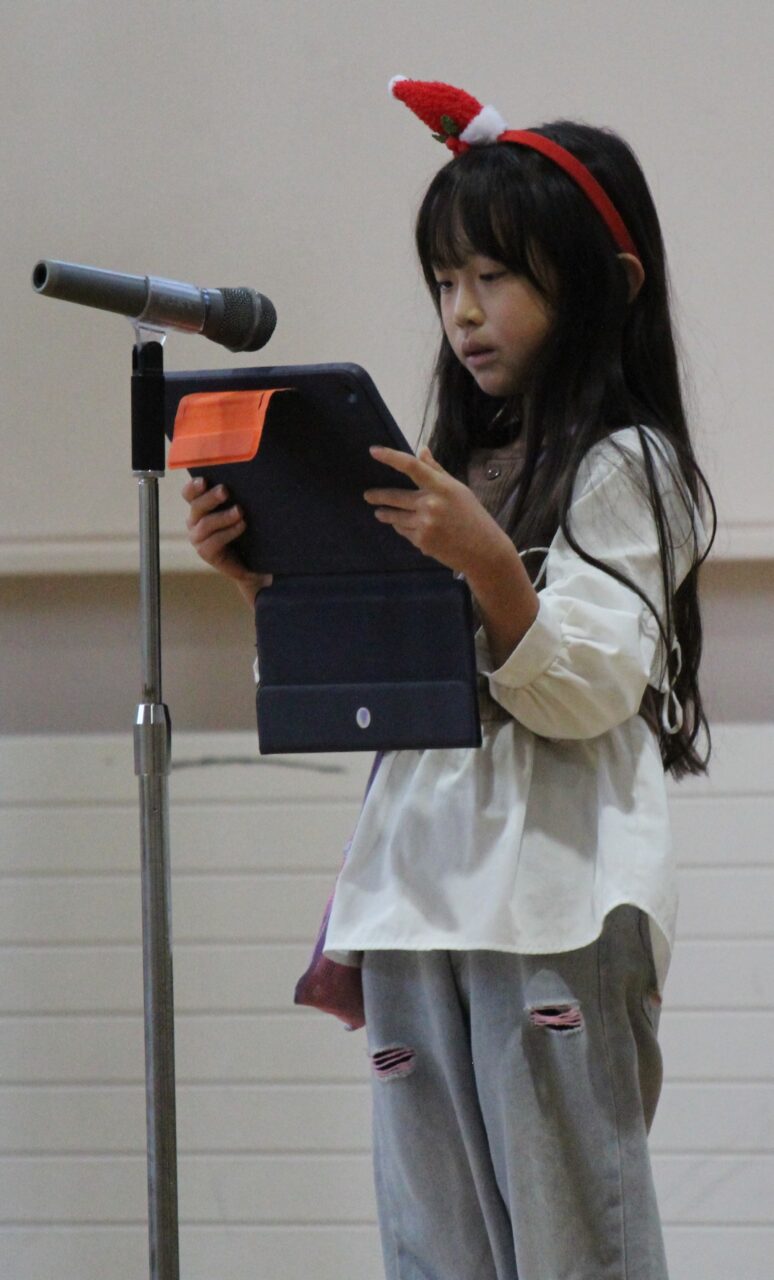 最後に「学級代表の発表」では、1年生、3年生、5年生の代表が、2学期に頑張ったことや思い出を発表しました。「芋団子づくりが楽しかった」「学習発表会の歌や漢字50問テストを頑張った」「宿泊研修で食べたカレーライスが美味しかった」など、それぞれの思い出を振り返ってくれました。