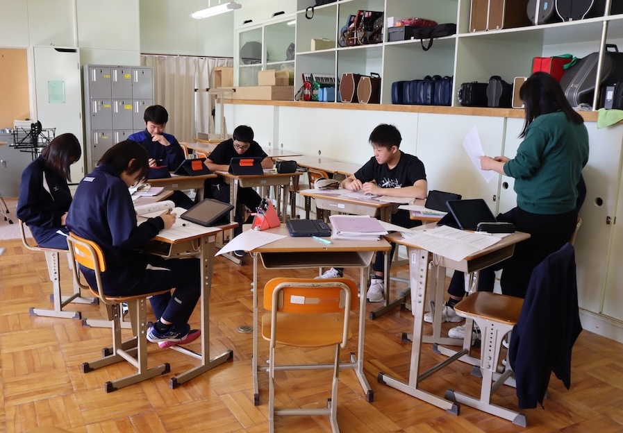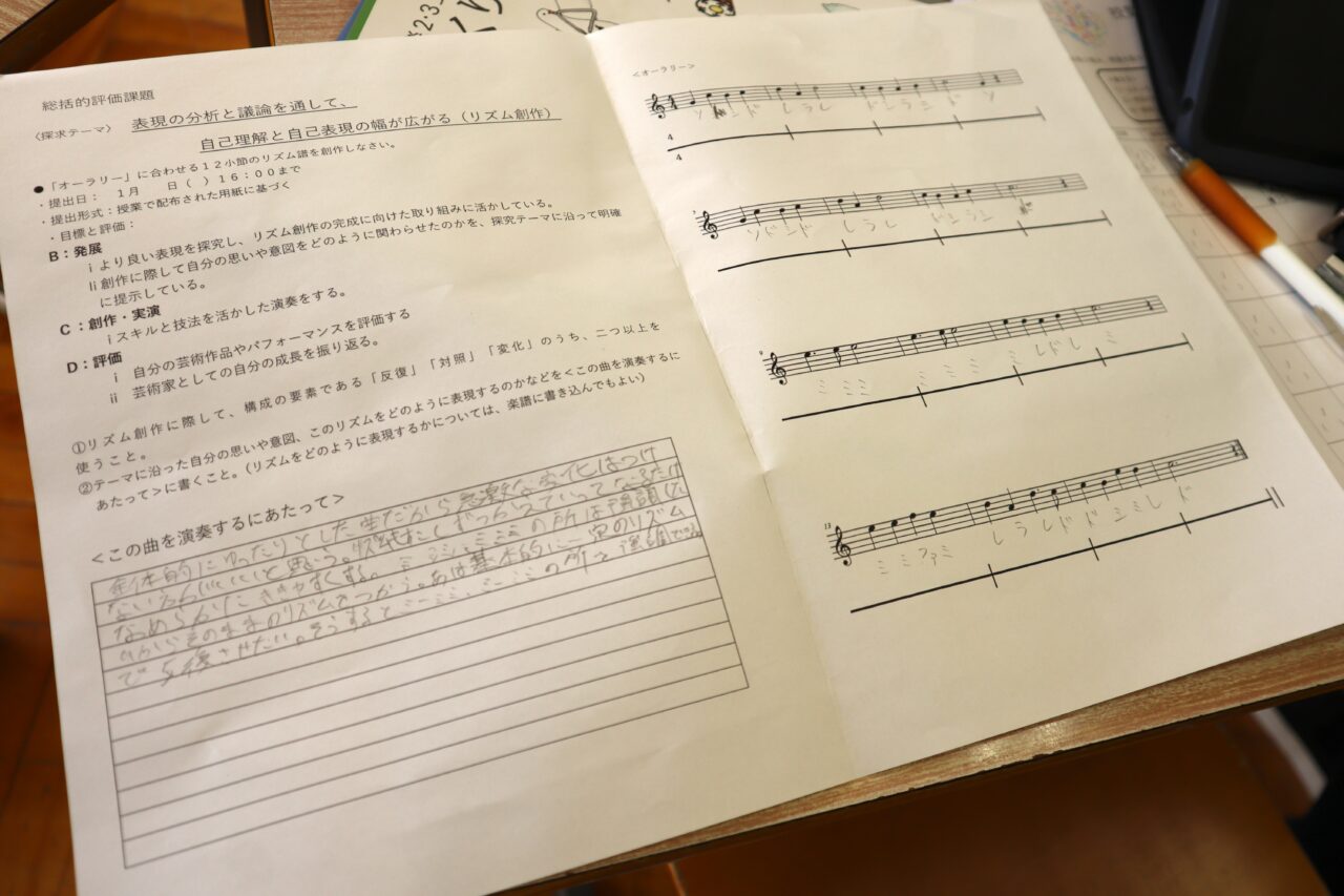 音楽室を覗くと、まるでテスト中かのような静寂。生徒たちが机を寄せ合い、カリカリと鉛筆を走らせていました。「音楽の授業で何やってるんだろう…」と、彼らが涼みに行った隙にプリントを盗み見ると…なんと!
