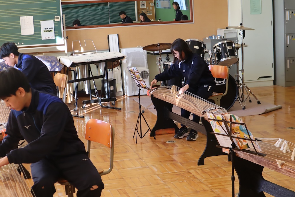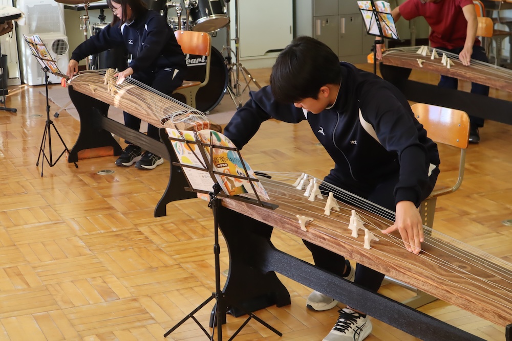 和の音色 巻き戻されて 元旦だ 投稿日 2026年1月23日 著者 瓜幕中学校 カテゴリー ニュース カテゴリー 学校紹介 カテゴリー 瓜幕中学校 今日の2年生の音楽室は、まるで「時が巻き戻った」かのような錯覚に。 箏(こと)の優雅な調べが響き渡ると、私の魂はあっという間に「冬休み」へと強制連行されました。 生徒が真剣に弦を弾く横で、私の頭の中は「お雑煮の餅、何個食べたっけな…」と、平和すぎる回想録でいっぱいに。 授業だというのに、、、すみません。 「 爪つけて 友達追いかけ 叱られる 」爪をつければ強くなった気分になります。by教頭