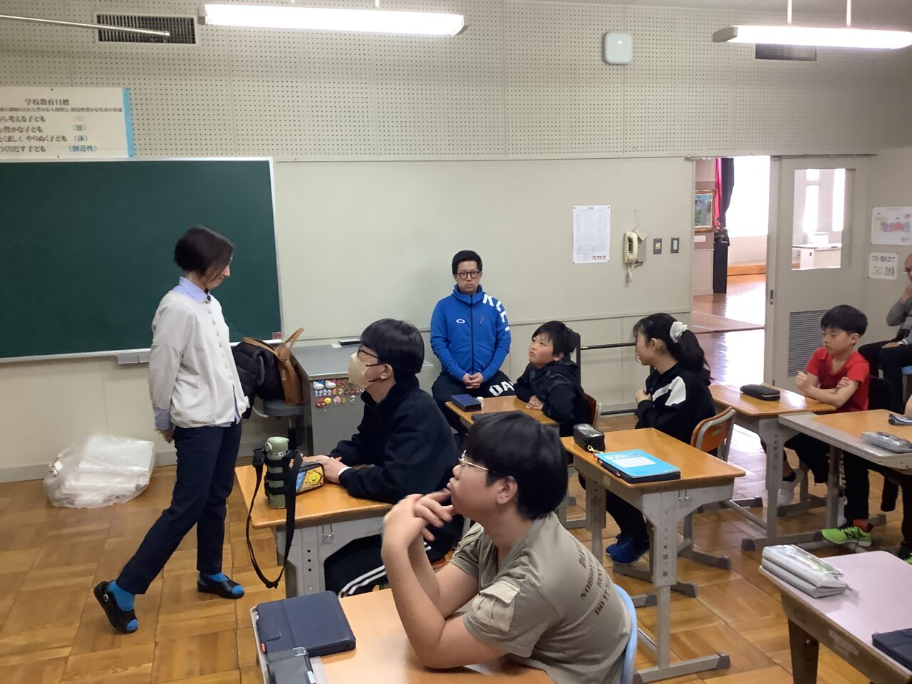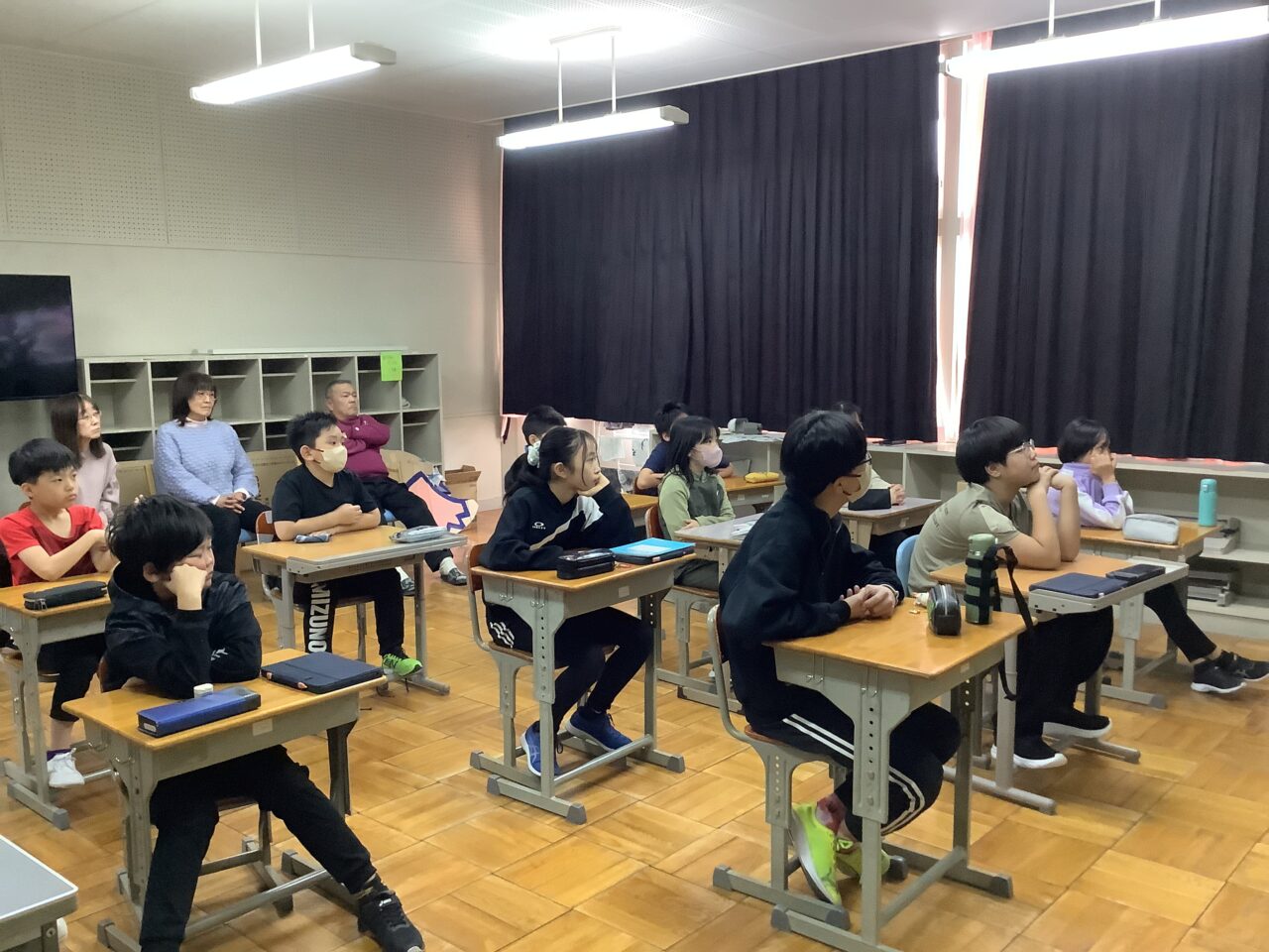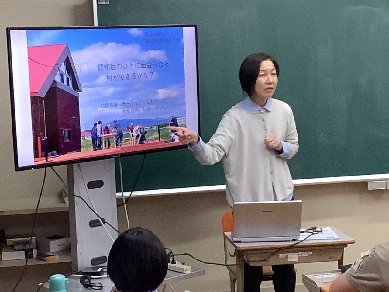 昨年12月4日に「認知症の世界」の第一人者の筧 裕介さんをお迎えし、認知症のひとの「ものの見え方」や「考え方」を中心に学習しました。今回、町の看護師「かしわのもり」の松山なつむさんをお迎えして、「認知症のひとに出会ったら何ができるか?」を子どもたちと一緒に考えました。初めに、前回学習したことを振り返りました。人の顔がわからなくなる「顔なし族の村」の話や、距離や方角がわからなくなる「二次元銀座商店街」の話など、子どもたちは筧さんの話をよく覚えていました。
