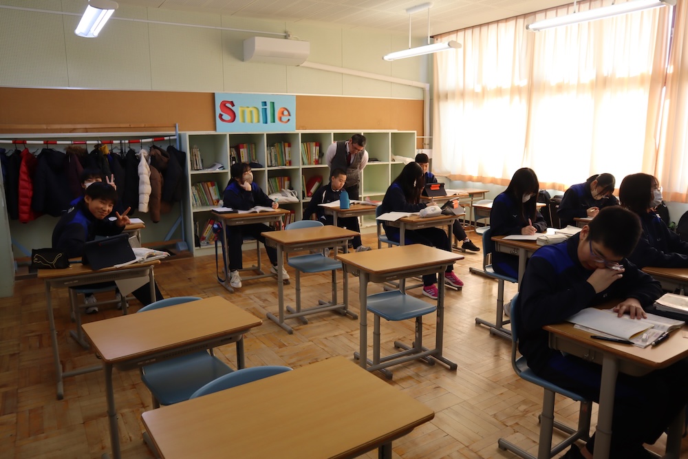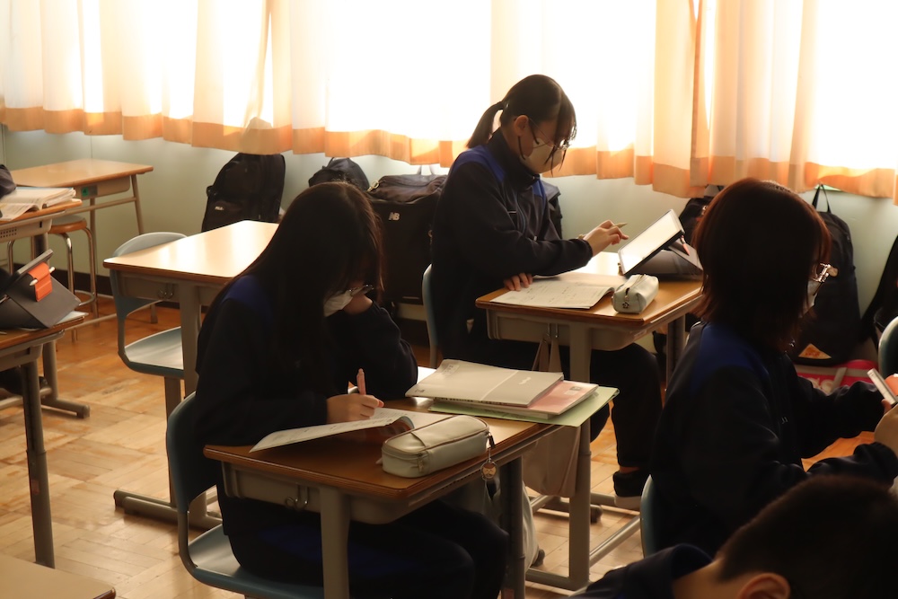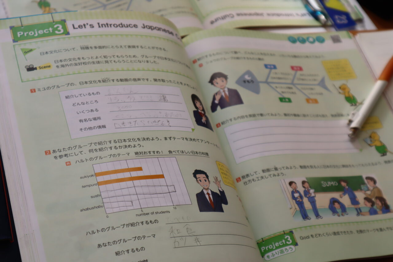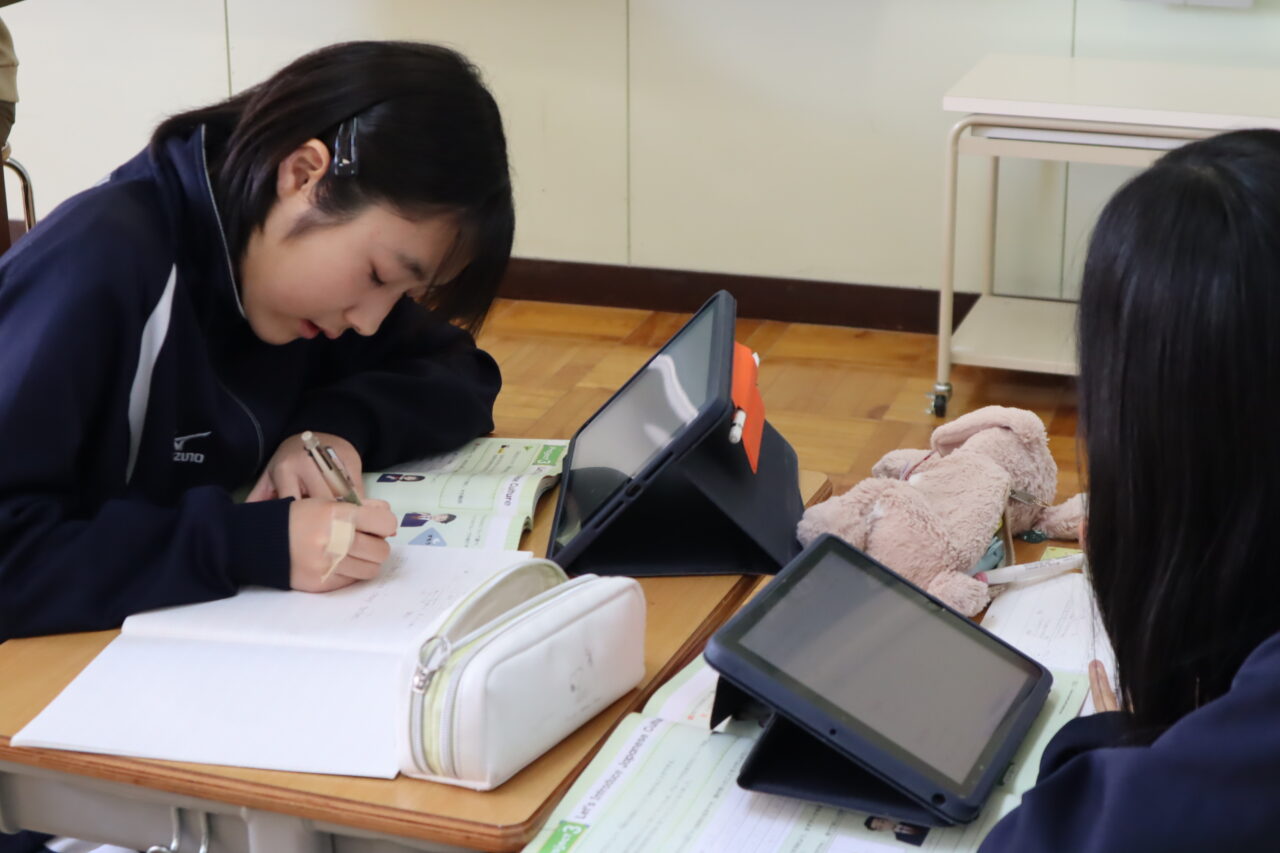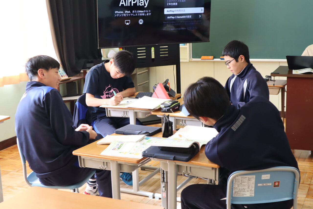 となりの2年生教室を覗くと、英語で「Money! Money!」と聞こえてきます。日本文化の紹介らしいのですが、なぜか話題は「お年玉」や「クリスマスプレゼント」、「物価高」に……。「国際経済会議」の様相を呈していました。中学生のマネーリテラシー、英語力とともに爆上がり中!