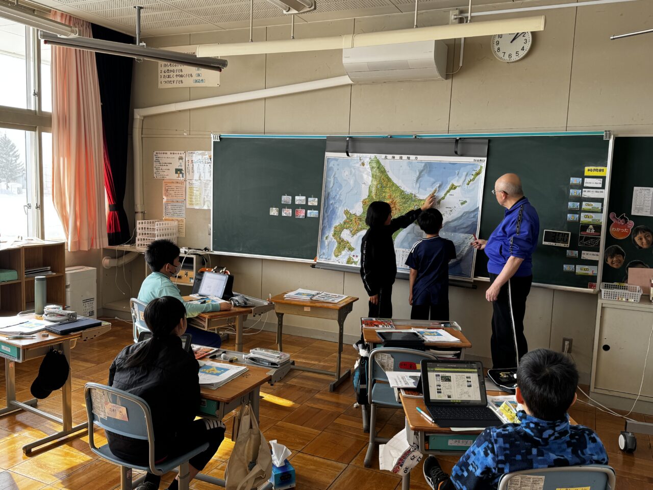4年生社会の学習で、北海道の地名について学習しました。北海道の根室市から北方四島の歯舞諸島までは4km。歯舞諸島はロシアの領土になっているけど、天気の良い日は歯舞諸島まで肉眼で見えるという話に子どもたちも驚いていました。