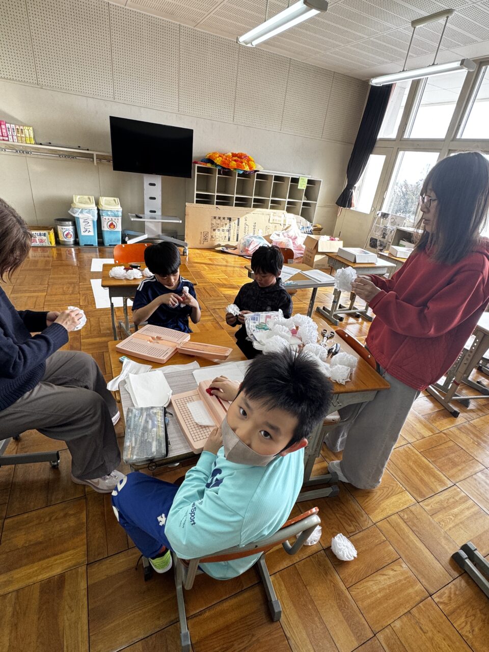 ここのグループは体育館の壁面飾りを作っているグループです。白い紙花で雲を作っているそうです。白い花紙を5枚で1つの花を作っています。