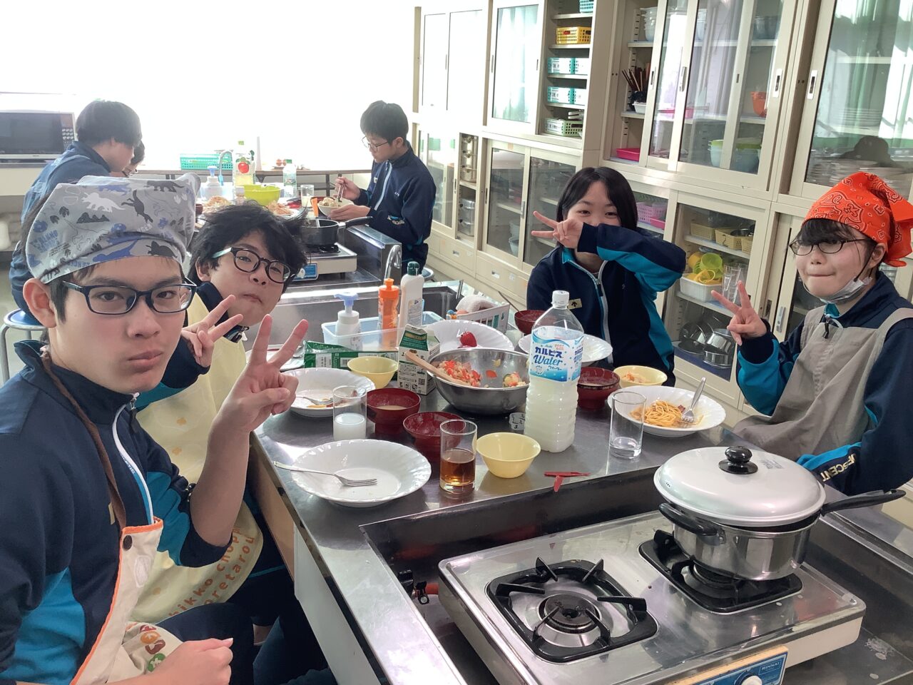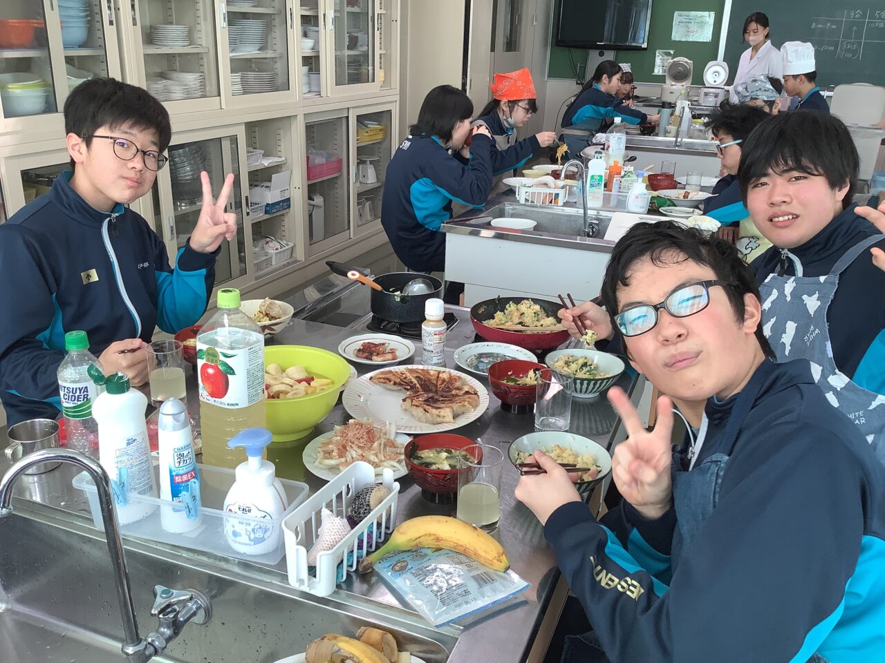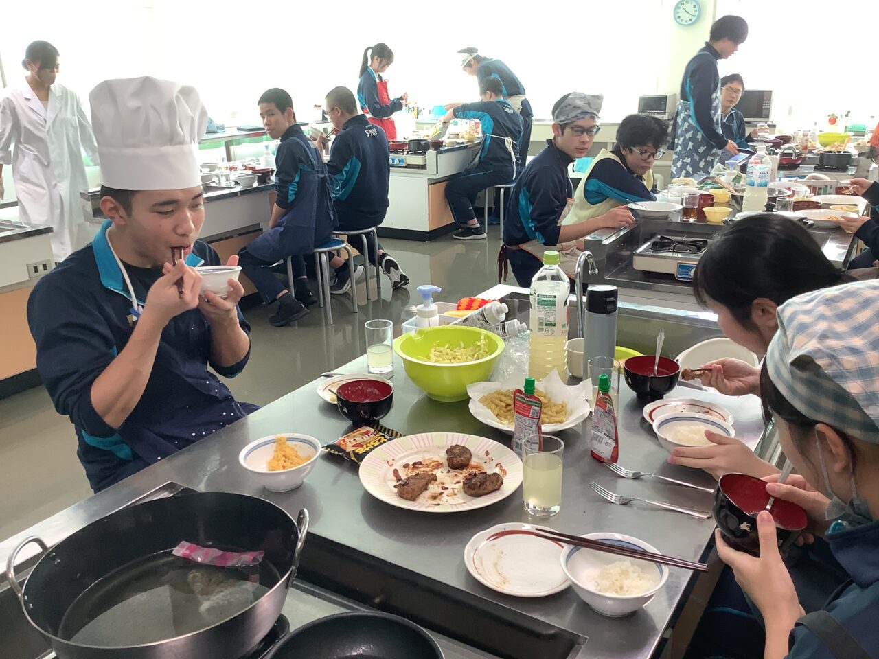 廊下へ出ると、何やらイイ匂い…つられて調理室へ向かうと、2年生たちが調理実習を終えて試食会をしていました。担当教諭によると、「五大栄養素を全て含めること」「一食分の組み立てを考えること」「予算内に収めること」などを課題に、班ごとに様々なメニューを探究したようです!