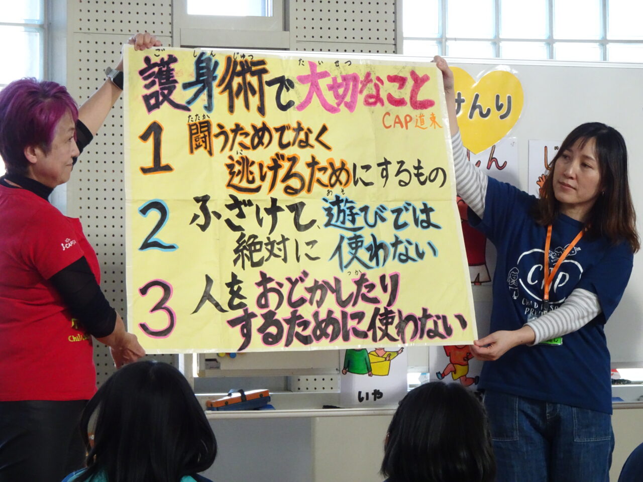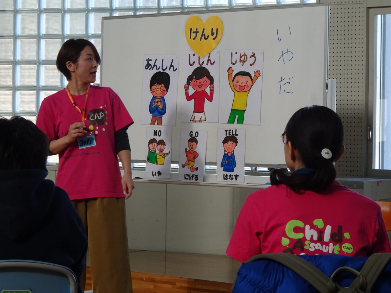 2月25日にCAP道東の皆さんをお迎えして、いじめ、不審者等への対応、人との距離感など、自分や友だちの身体や心を守るための方法を学びました。具体的なシチュエーション(ミニ劇)を見たり体験したりしながら、子どもの安心、元気、自由といった権利が守られているかを確かめていきました。そして、そのためにも困ったときは仲間や周りの大人に相談することの大切さを学びました。