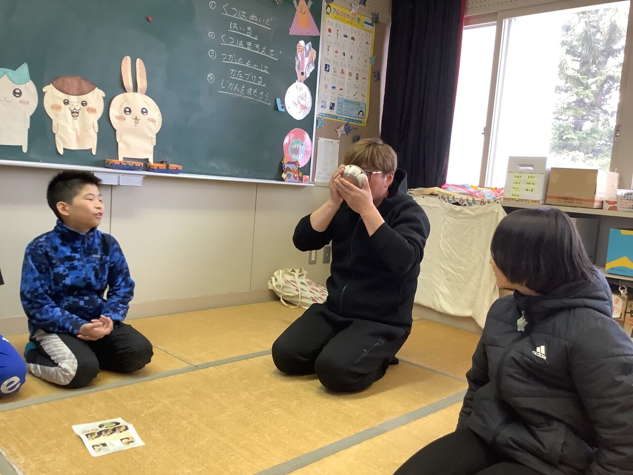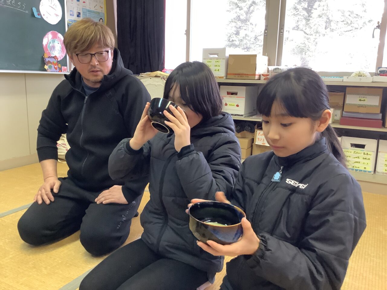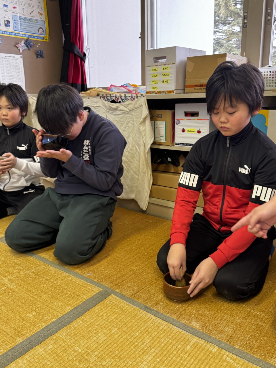 卒業式を目の前にした3月23日、輪島先生を講師に迎えお茶を点てて飲む機会がありました。「お茶をたてる」とは、「お茶を点てる」と表現します。中国の「点茶」からその由来があるそうです。4年生の湯茶の時間にたまたま来校されていた大地さんにも一服していただきました。