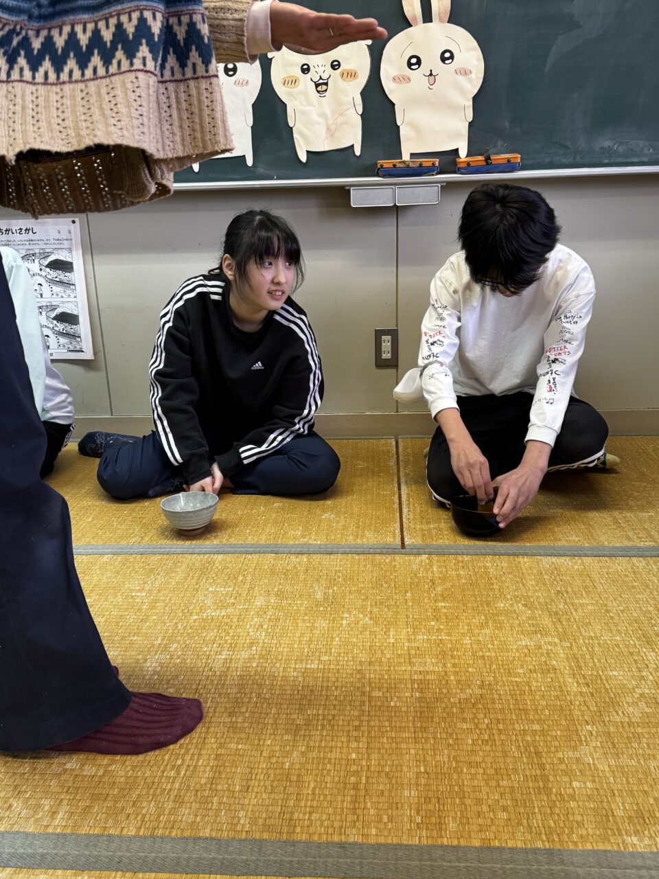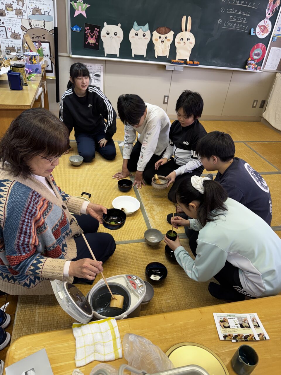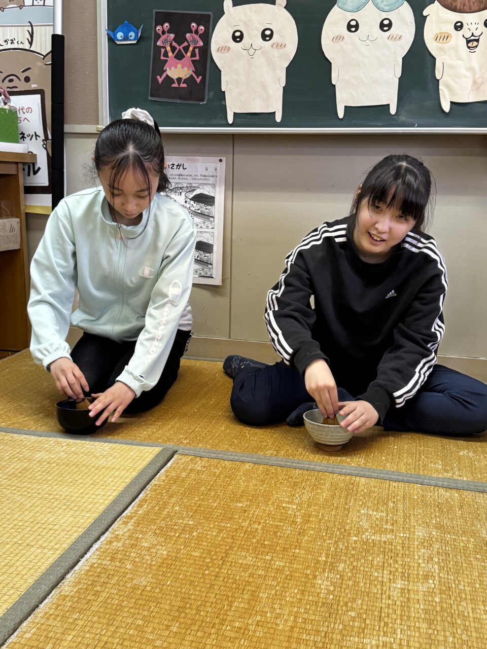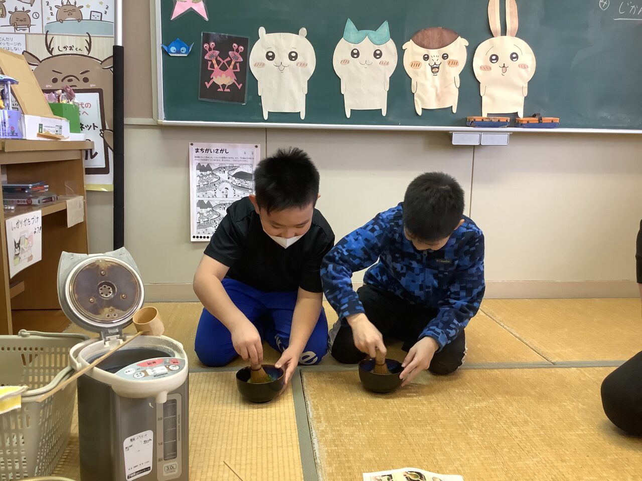 お茶を点てるときは手首を縦に細かく動かすことがコツのようで、みんな頑張ってやっていました。