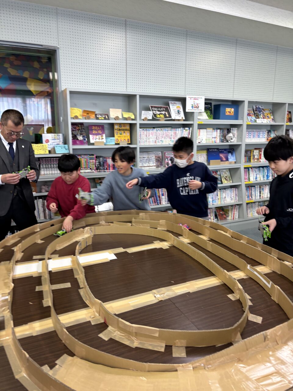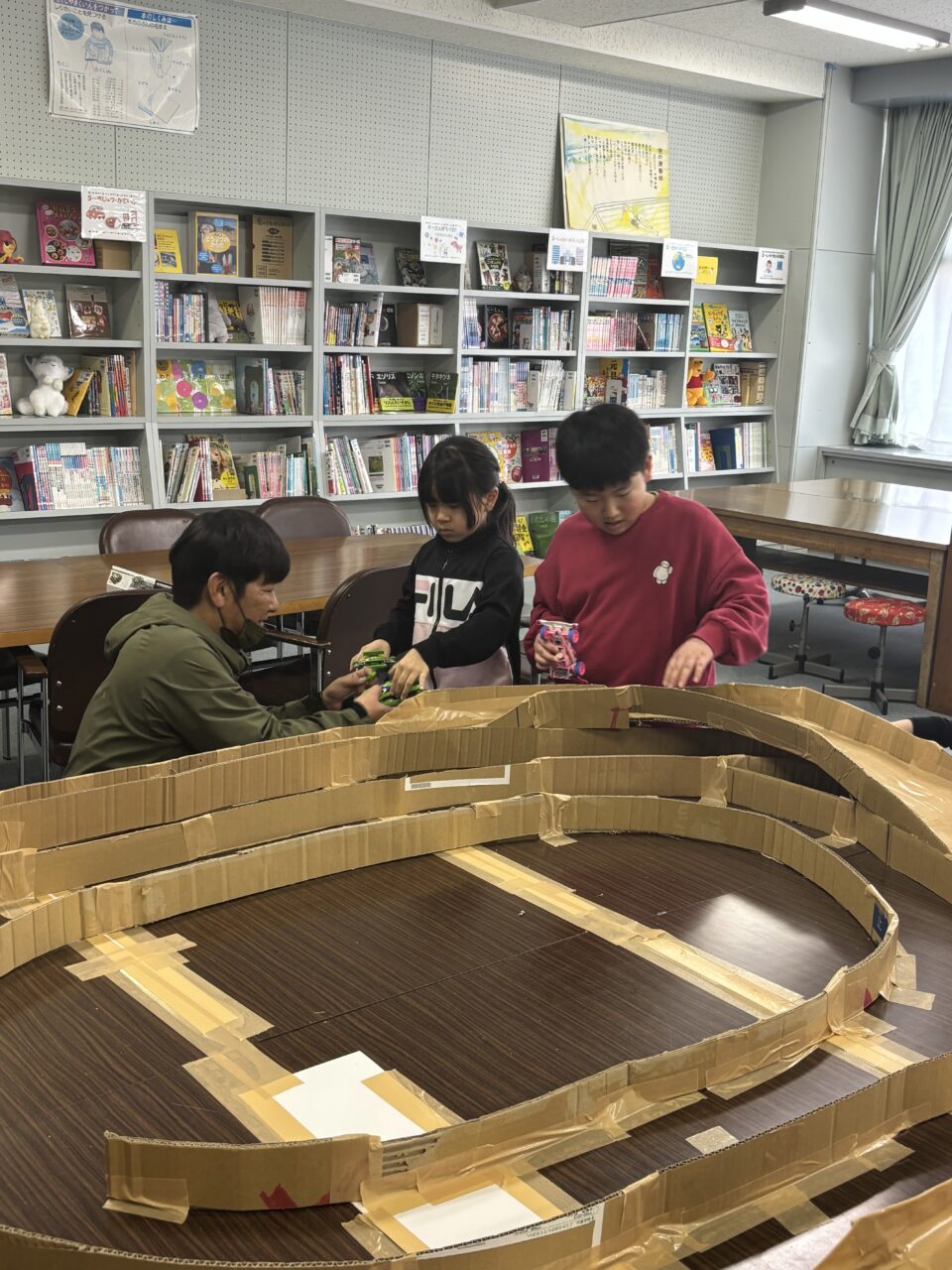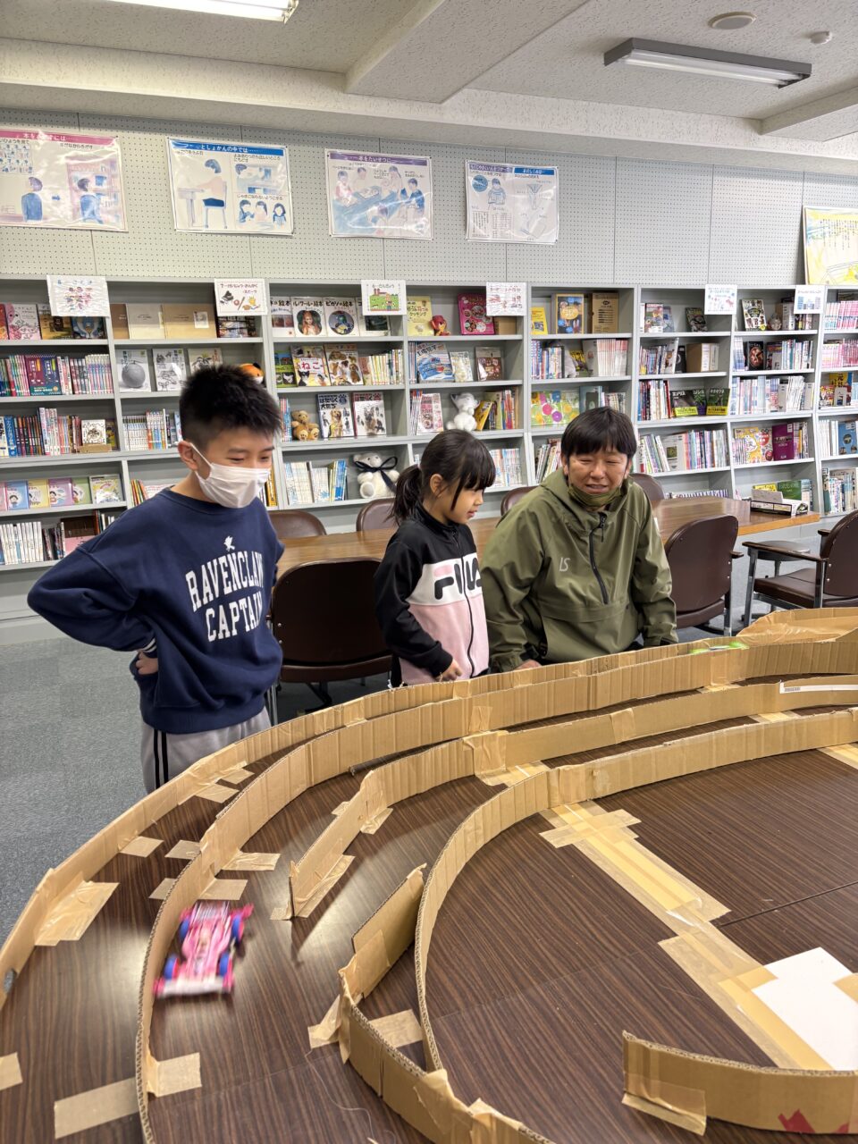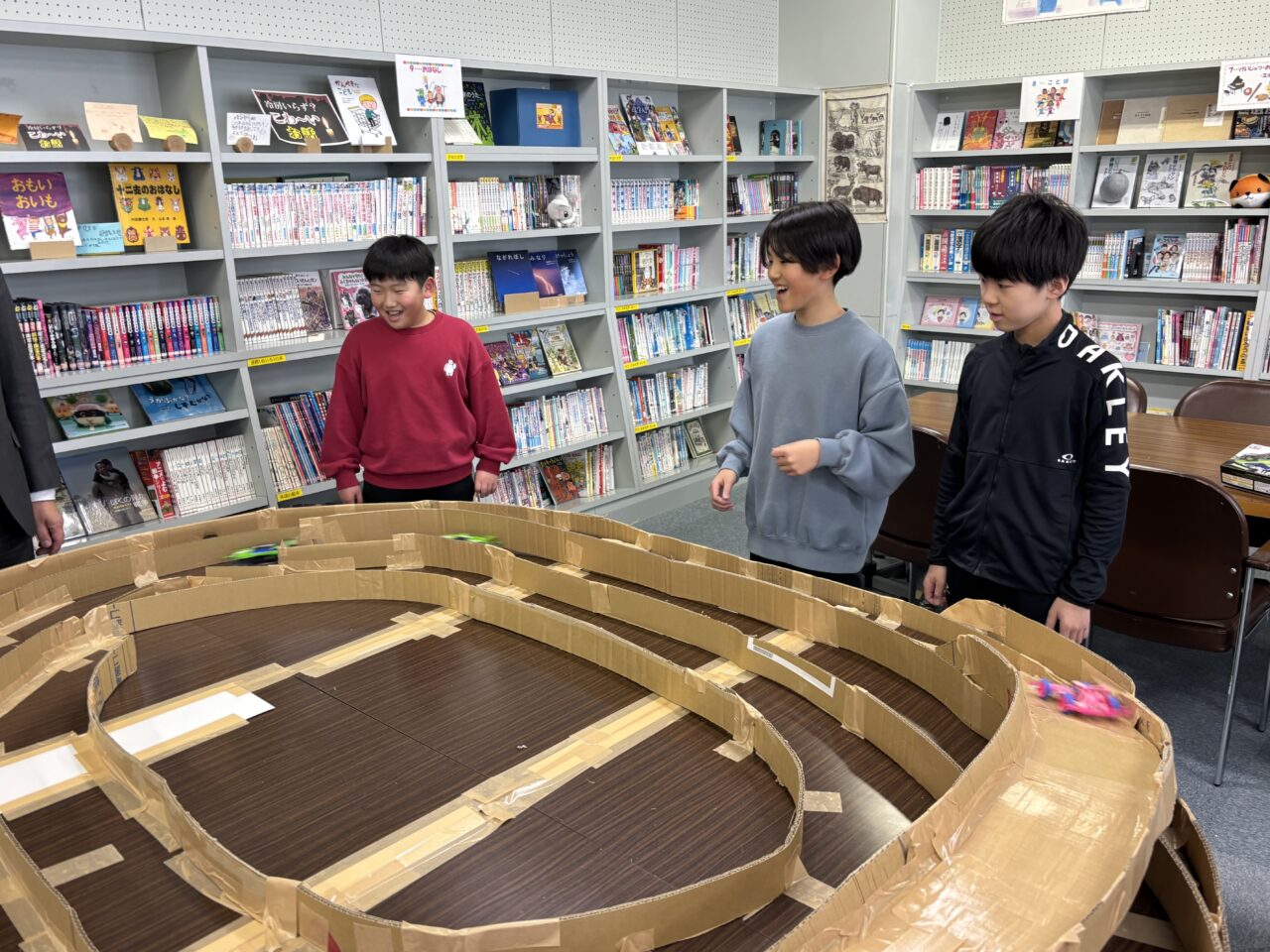 図書室の丸テーブルをサーキットコースに見立て、インターネットで調べた情報をもとに、段ボールを使い、子どもたち自身がコースを設計しました。