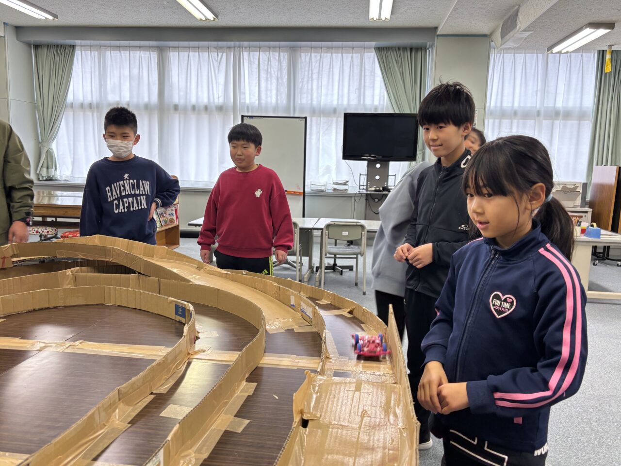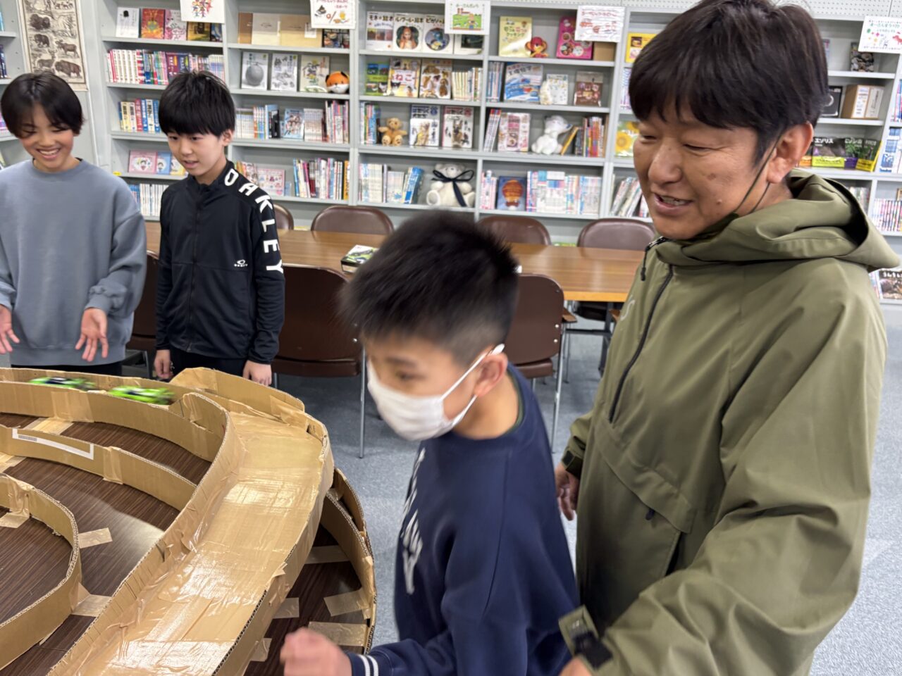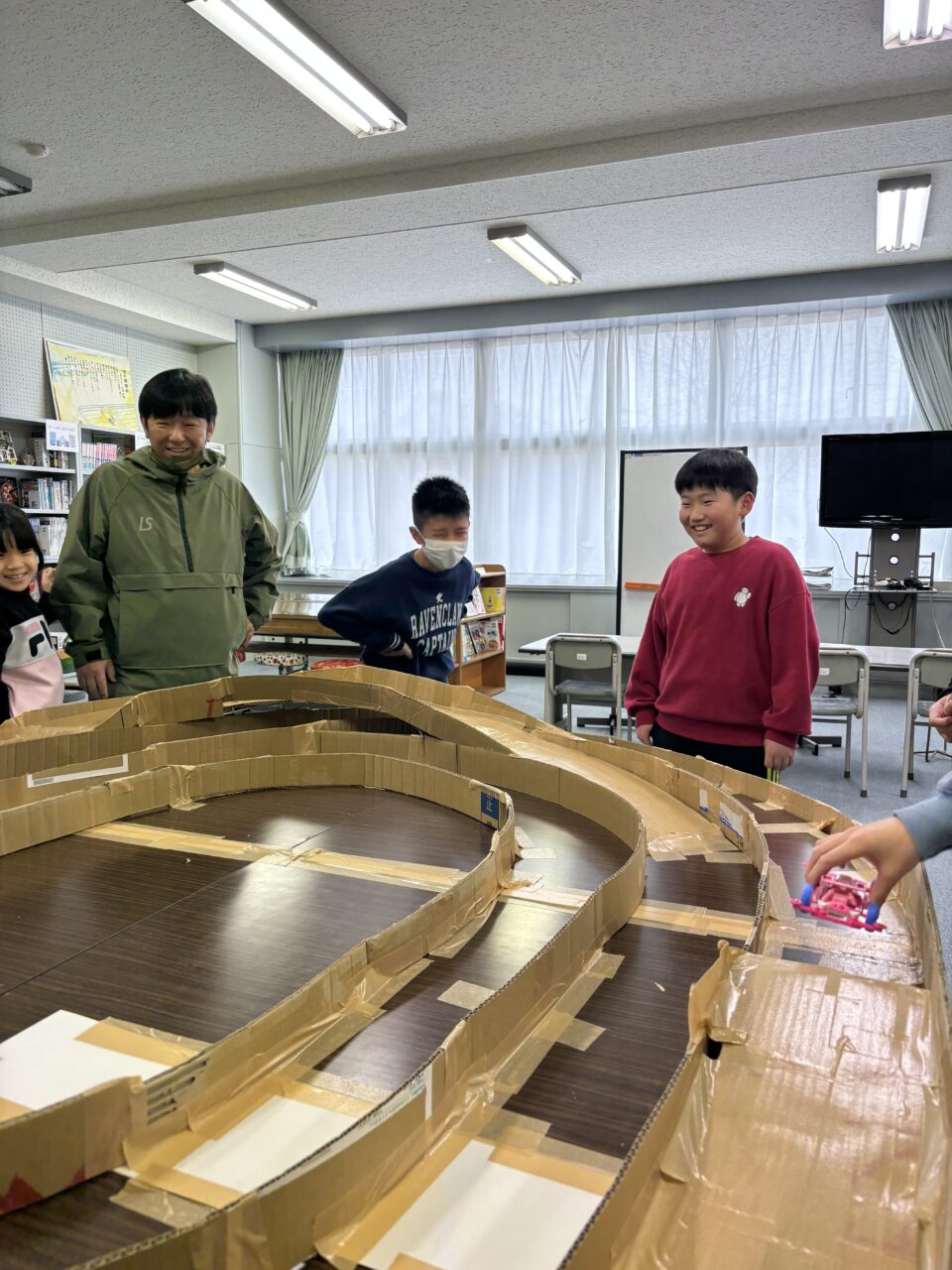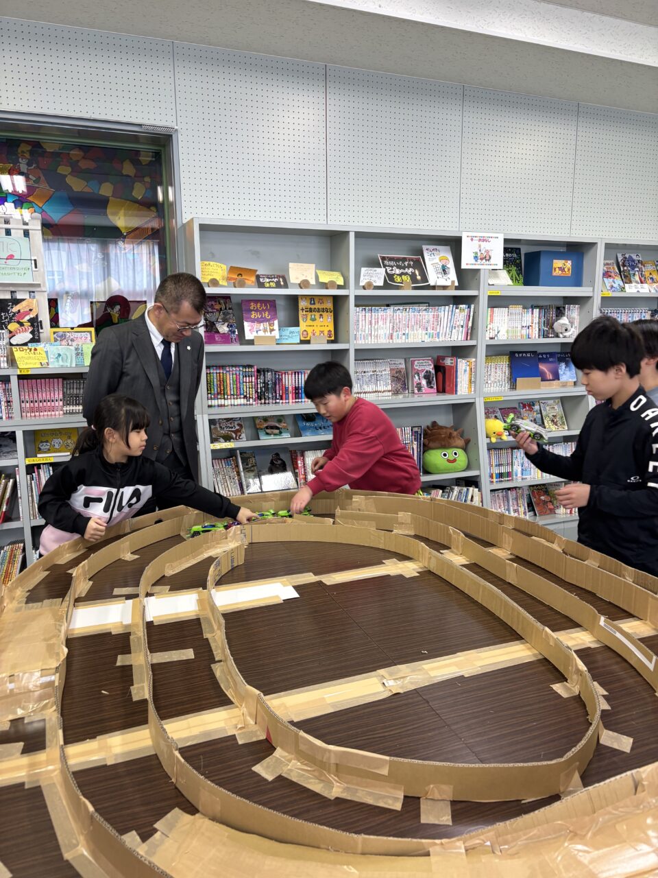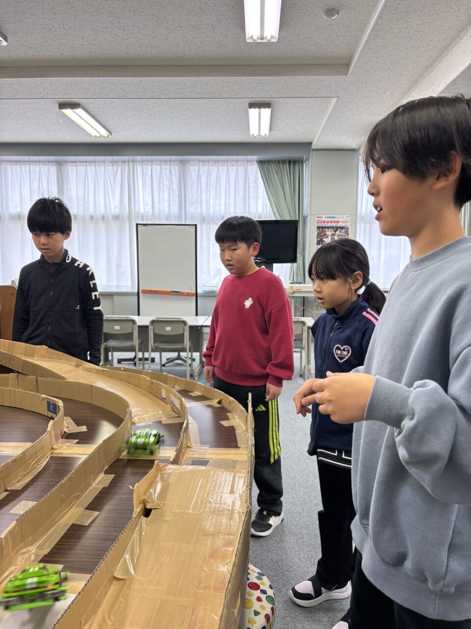 図書室の丸テーブルをサーキットコースに見立て、インターネットで調べた情報をもとに、段ボールを使い、子どもたち自身がコースを設計しました。
