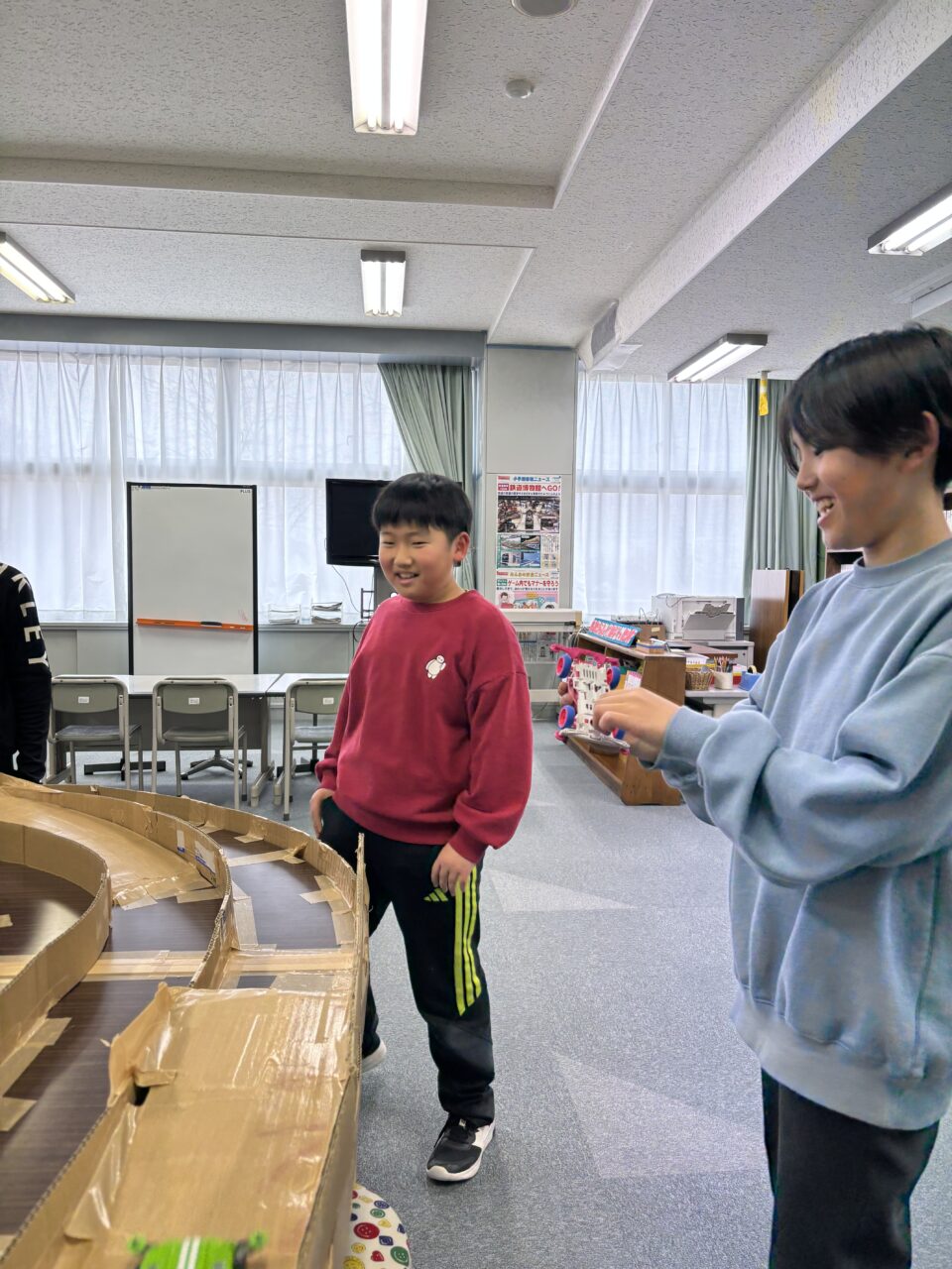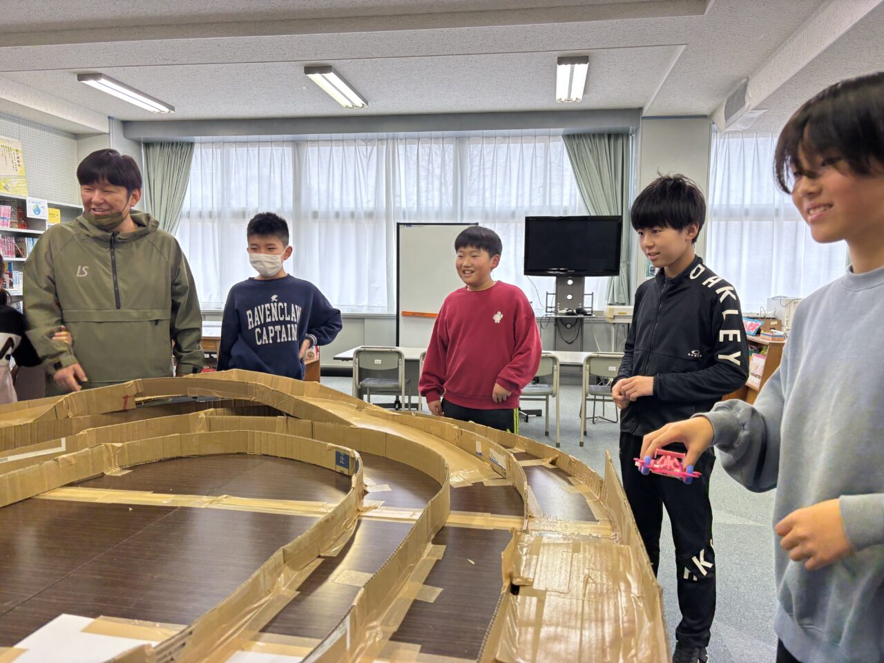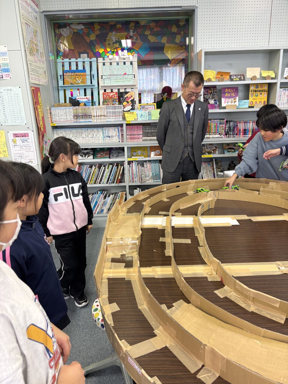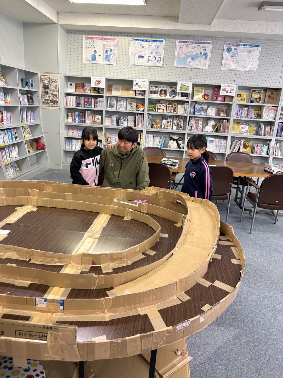 図書室の丸テーブルをサーキットコースに見立て、インターネットで調べた情報をもとに、段ボールを使い、子どもたち自身がコースを設計しました。