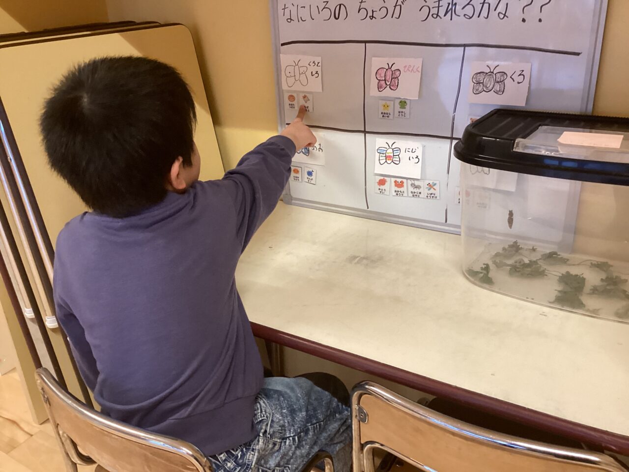 蛹になり一冬を越し、いよいよ羽化も近づいてきて、こども達から「何色の蝶々が生まれるのかな?」という声があり、担任はこども達と一緒に